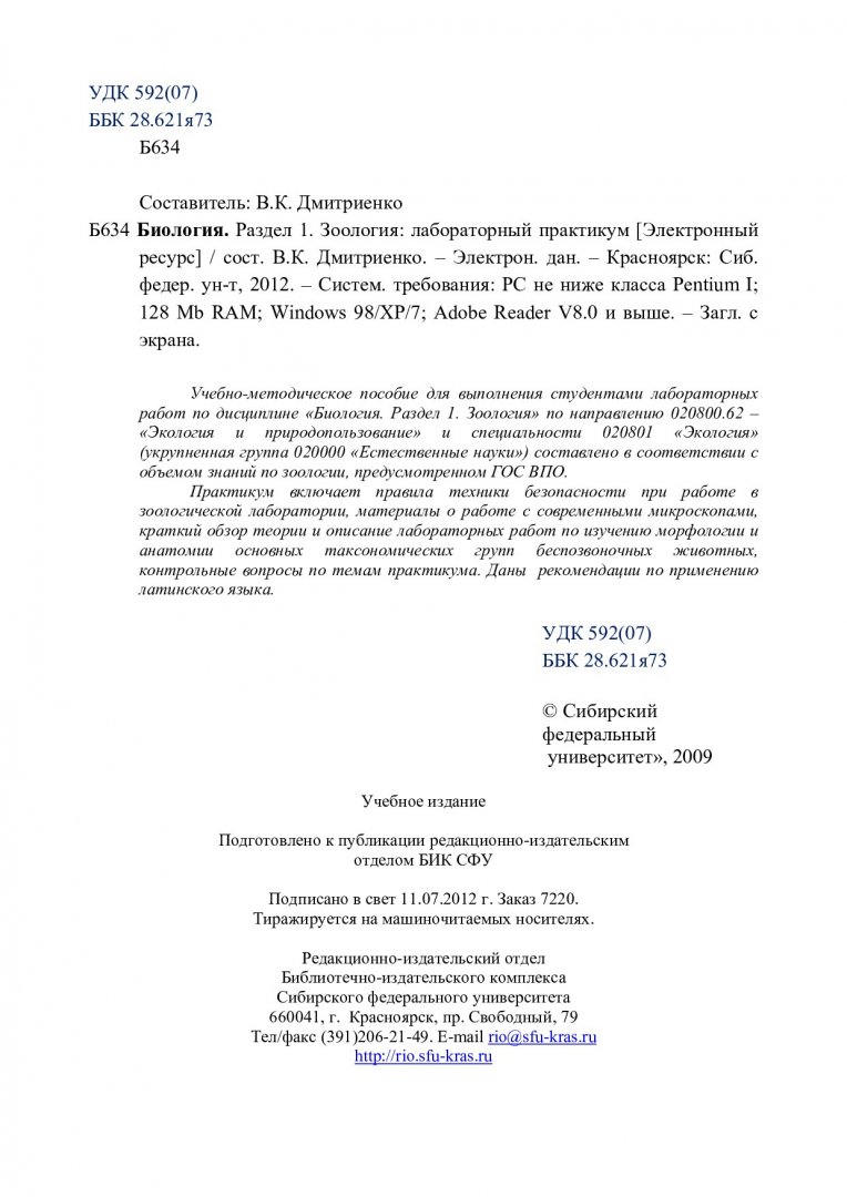 Библиографическое описание:Биология. Раздел 1. Зоология : лаб. практикум [для студентов спец. 020801 «Экология»] / Сиб. федерал. ун-т ; сост. В. К. Дмитриенко. - Электрон. текстовые дан. (PDF, 23,3 Мб). - Красноярск : СФУ, 2009. - Загл. с титул. экрана. - Библиогр.: с. 92-93. - Текст : электронный.