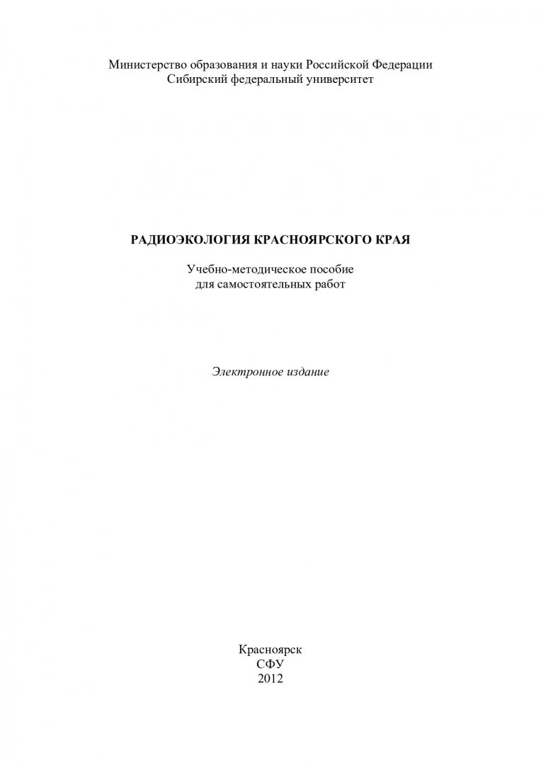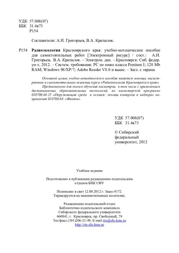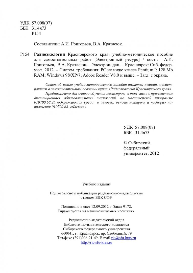 Библиографическое описание:Радиоэкология Красноярского края : учеб.-метод. пособие для самостоят. работ [для студентов спец. 010700.68.25 «Окружающая среда и человек: основы контроля и надзора»] / Сиб. федерал. ун-т ; сост.: А. И. Григорьев, В. А. Кратасюк. - Электрон. текстовые дан. (PDF, 216 Кб). - Красноярск : СФУ, 2012. - Загл. с титул. экрана. - Библиогр.: с. 10. - Б. ц. - Текст : электронный.