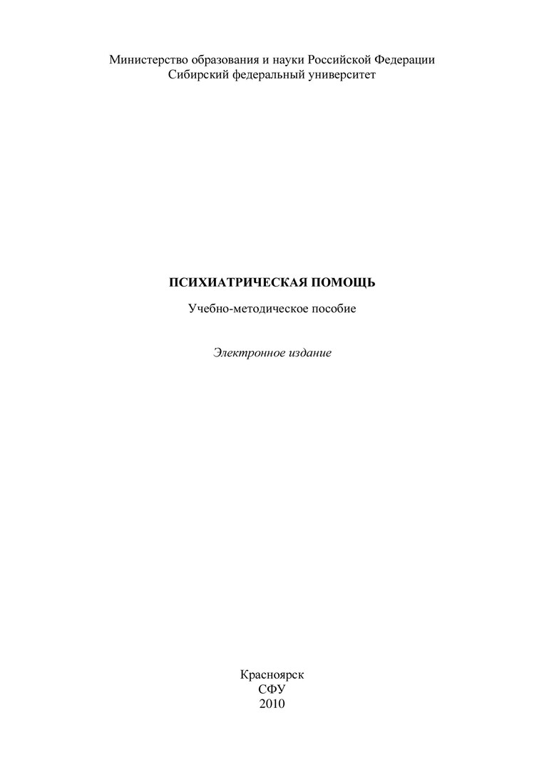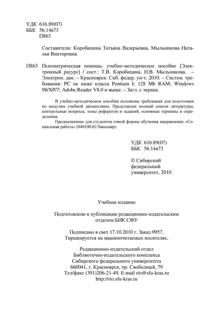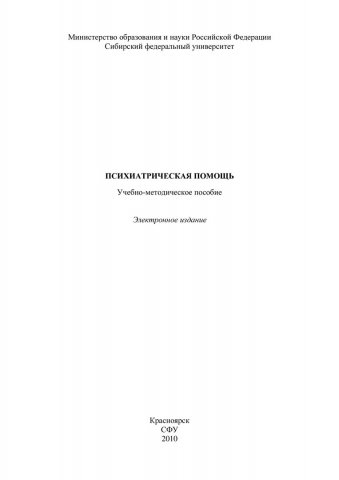 Библиографическое описание:Психиатрическая помощь : учеб.-метод. пособие [для студентов напр. 040100.62 "Социальная работа"] / Сиб. федерал. ун-т ; сост.: Т. В. Коробицина, Н. В. Мыльникова. - Электрон. текстовые дан. (PDF, 302 Кб). - Красноярск : СФУ, 2010. - Загл. с титул. экрана. - Библиогр.: с. 25. - Б. ц. - Текст : электронный.