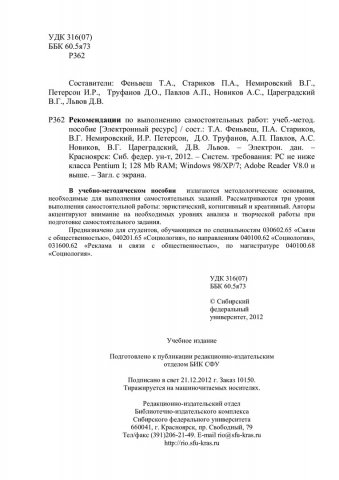 Библиографическое описание:Рекомендации по выполнению самостоятельных работ : учеб.-метод. пособие [для студентов спец. 030602.65 «Связи с общественностью», 040201.65 «Социология», напр. 040100.62 «Социология», 031600.62 «Реклама и связи с общественностью», 040100.68 «Социология»] / Сиб. федерал. ун-т ; сост. Т. А. Феньвеш [и др.]. - Электрон. текстовые дан. (PDF, 510 Кб). - Красноярск : СФУ, 2012. - Загл. с титул. экрана. - Б. ц. - Текст : непосредственный.