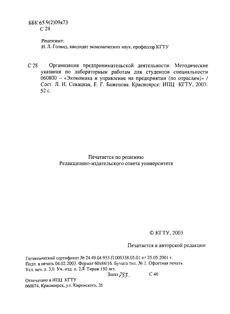 Библиографическое описание:Секацкая, Людмила Николаевна. Организация предпринимательской деятельности : метод. указ. по лаб. работам для студентов спец. 060800 / Л. Н. Секацкая, Е. Г. Баженова ; Краснояр. гос. техн. ун-т. - Красноярск : ИПЦ КГТУ, 2003. - 52 с. - Текст : непосредственный + Текст : электронный.