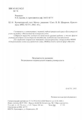Шадрина, Ирина Васильевна. Бухгалтерский учет : метод. указ. / И. В. Шадрина ; Краснояр. гос. техн. ун-т. - Красноярск : ИПЦ КГТУ, 2003. - 28 c. - Загл. с титул. экрана. - Текст : электронный.