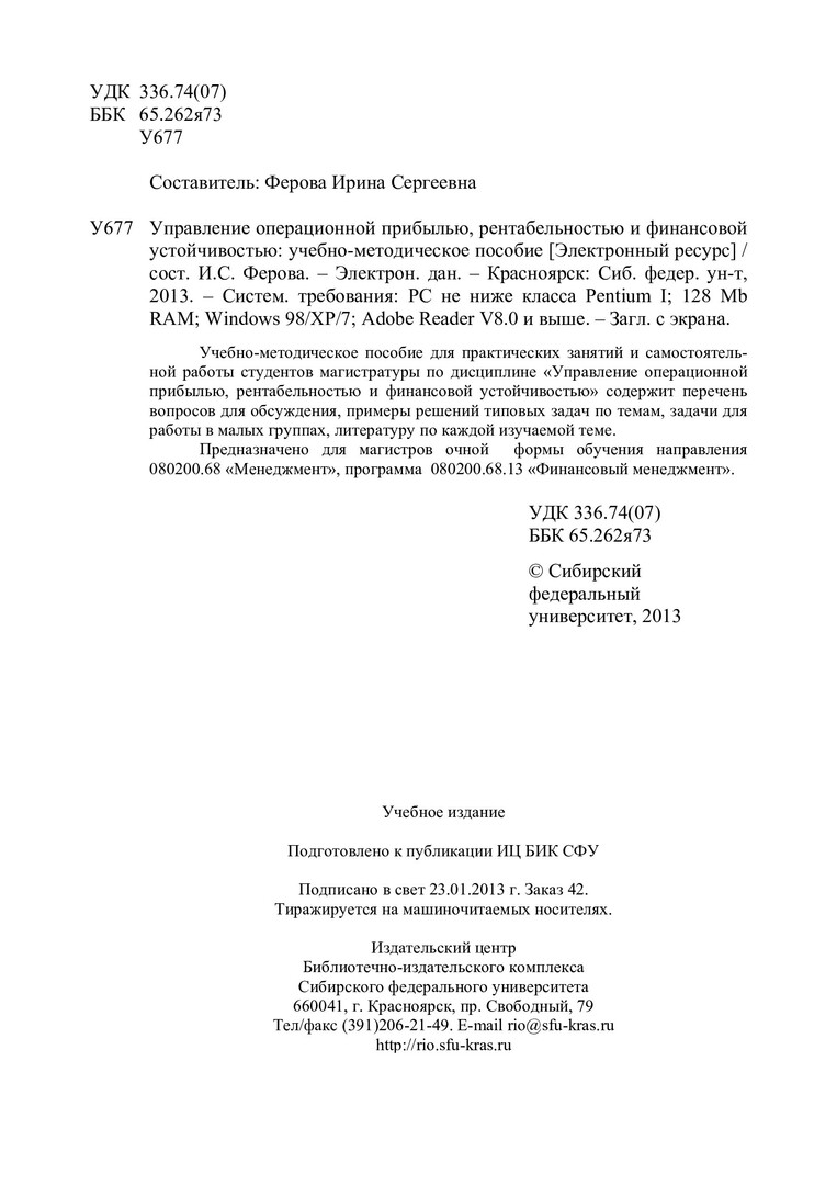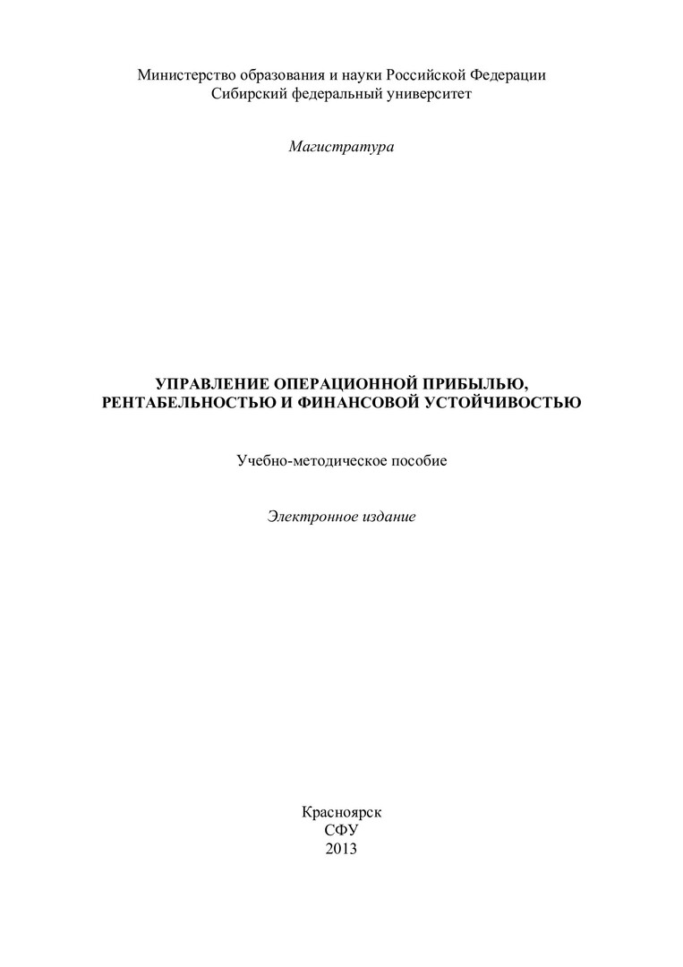 Библиографическое описание:Управление операционной прибылью, рентабельностью и финансовой устойчивостью : учеб.-метод. пособие [для практич. занятий и самостоят. работы для студентов напр. 080200.68 «Менеджмент», программа 080200.68.13 «Финансовый менеджмент» очной формы обучения] / Сиб. федерал. ун-т ; сост. И. С. Ферова. - Электрон. текстовые дан. (PDF, 303 Кб). - Красноярск : СФУ, 2013. - (Магистратура). - Загл. с титул. экрана. - Библиогр. в конце разд. - Изд. № 2013-42. - Текст : электронный.