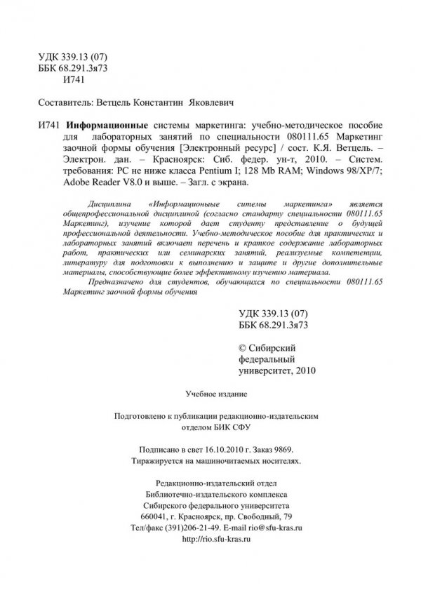 Библиографическое описание:Информационные системы маркетинга : учеб.-метод. пособие для лаб. занятий по спец. 080111.65 Маркетинг заоч. формы обучения / Сиб. федерал. ун-т ; сост. К. Я. Ветцель. - Электрон. текстовые дан. (PDF, 518 Кб). - Красноярск : СФУ, 2010. - Загл. с титул. экрана. - Библиогр.: с. 18-19. - Текст : электронный.