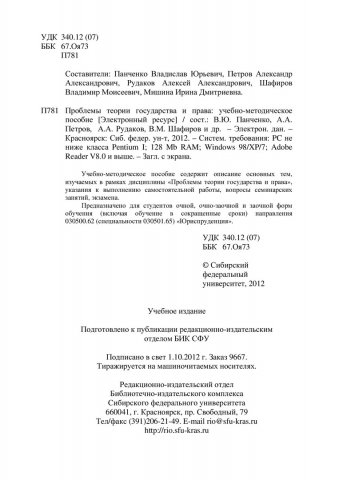 Библиографическое описание:Проблемы теории государства и права : учеб.-метод. пособие [для студентов напр. 030500.62 (спец. 030501.65) «Юриспруденция»] / Сиб. федерал. ун-т ; сост. В. Ю. Панченко [и др.]. - Электрон. текстовые дан. (PDF, 911 Кб). - Красноярск : СФУ, 2012. - Загл. с титул. экрана. - Библиогр.: с. 6-15. - Б. ц. - Текст : электронный.
