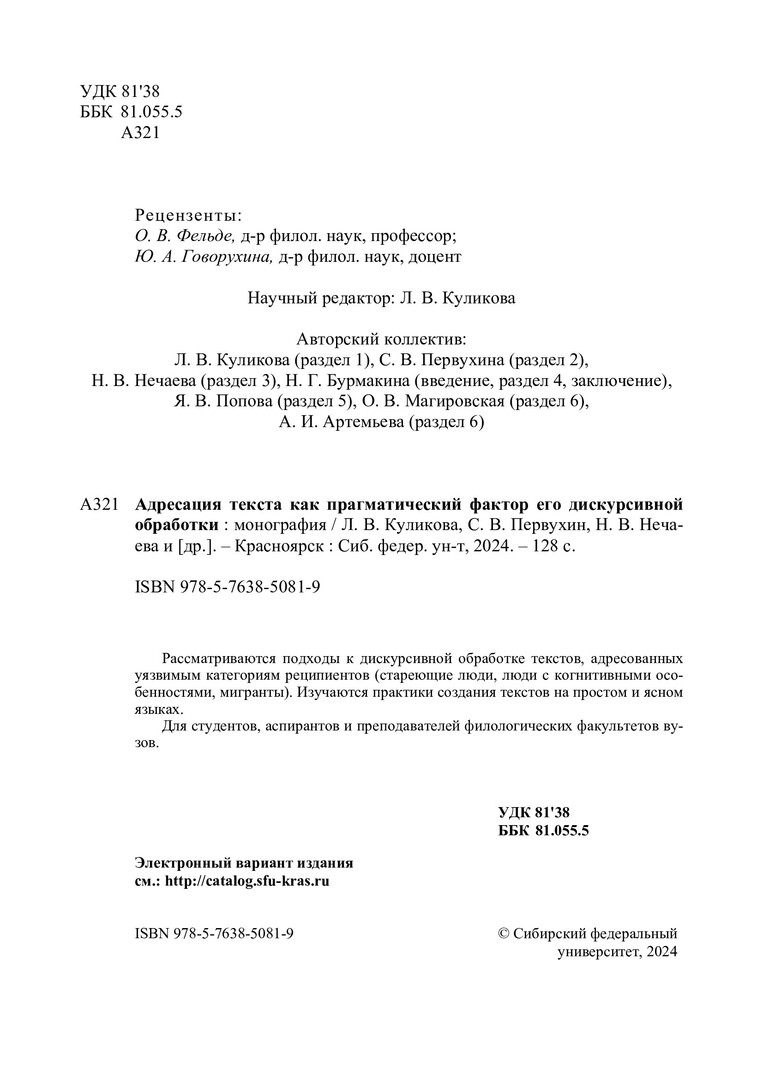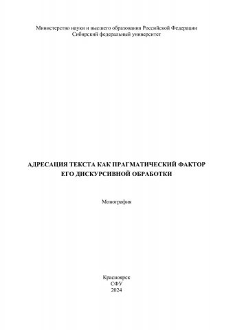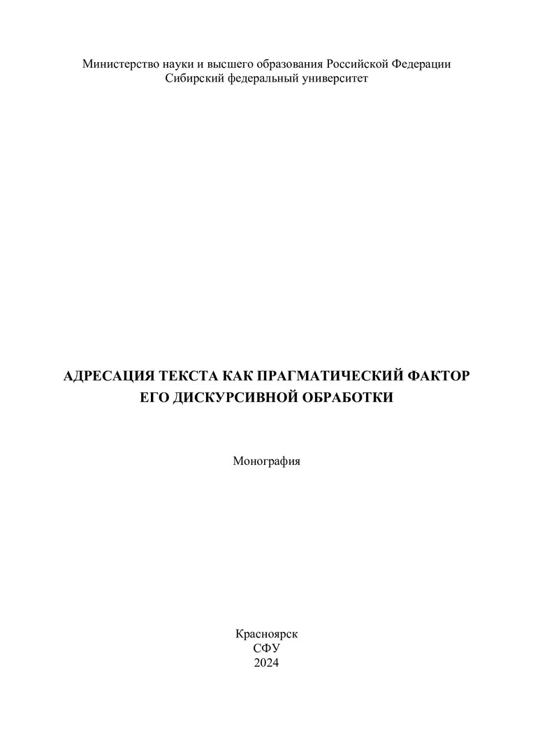 Библиографическое описание: Адресация текста как прагматический фактор его дискурсивной обработки : монография / [Л. В. Куликова, С. В. Первухина, Н. В. Нечаева [и др.] ; рец.: О. В. Фельде, Ю. А. Говорухина] ; Министерство науки и высшего образования Российской Федерации, Сибирский федеральный университет. - Красноярск : СФУ, 2024 (2024-12-26). - 124 с., 7,4 усл. печ. л. : цв. ил. - Библиогр.: с. 111-124. - 500 экз. - ISBN 978-5-7638-5081-9 : 119.04 р. - Изд. № 2024-23545. - Текст : электронный + Текст : непосредственный.