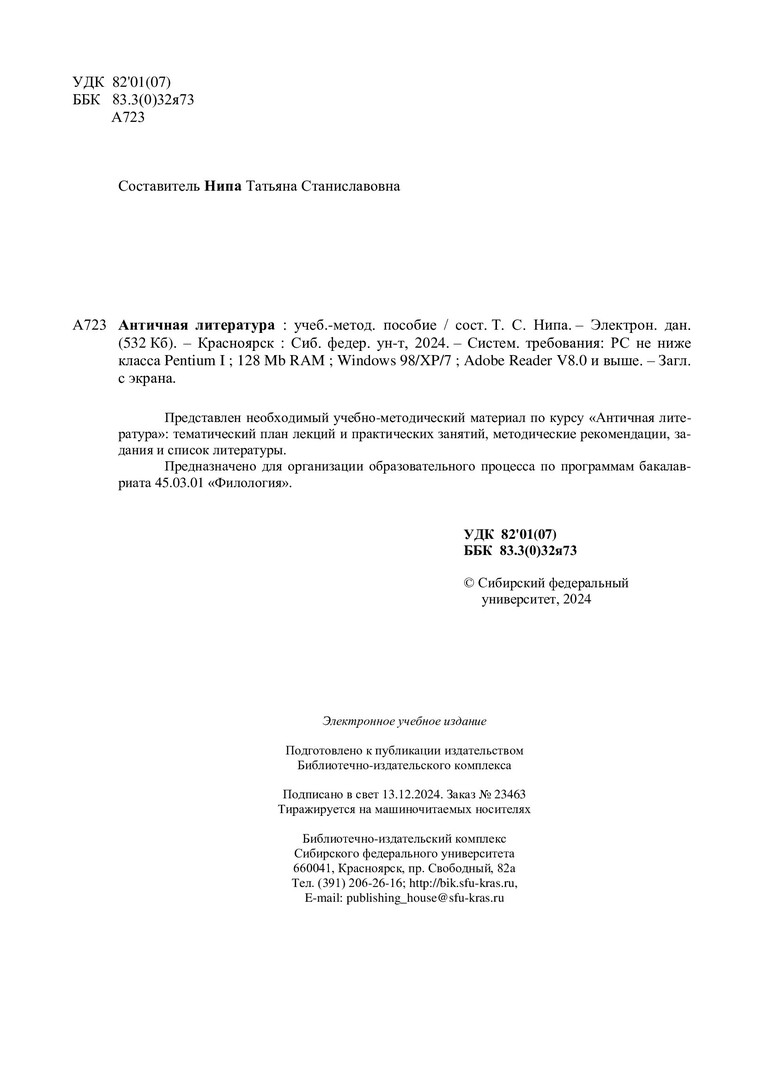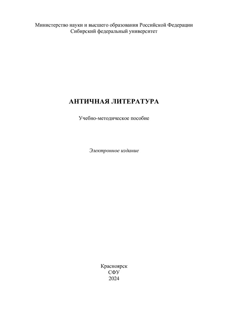 Библиографическое описание: Античная литература : учебно-методическое пособие / Сибирский федеральный университет, Институт филологии и языковой коммуникации ; сост. Т. С. Нипа. - Электрон. текстовые дан. (pdf, 0,6 Мб). - Красноярск : СФУ, 2024 (2024-12-13). - 26 с. - Загл. с титул. экрана. - Библиогр.: с. 23. - Изд. № 2024-23463 : Б. ц. - Текст : электронный.