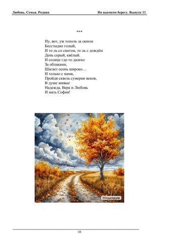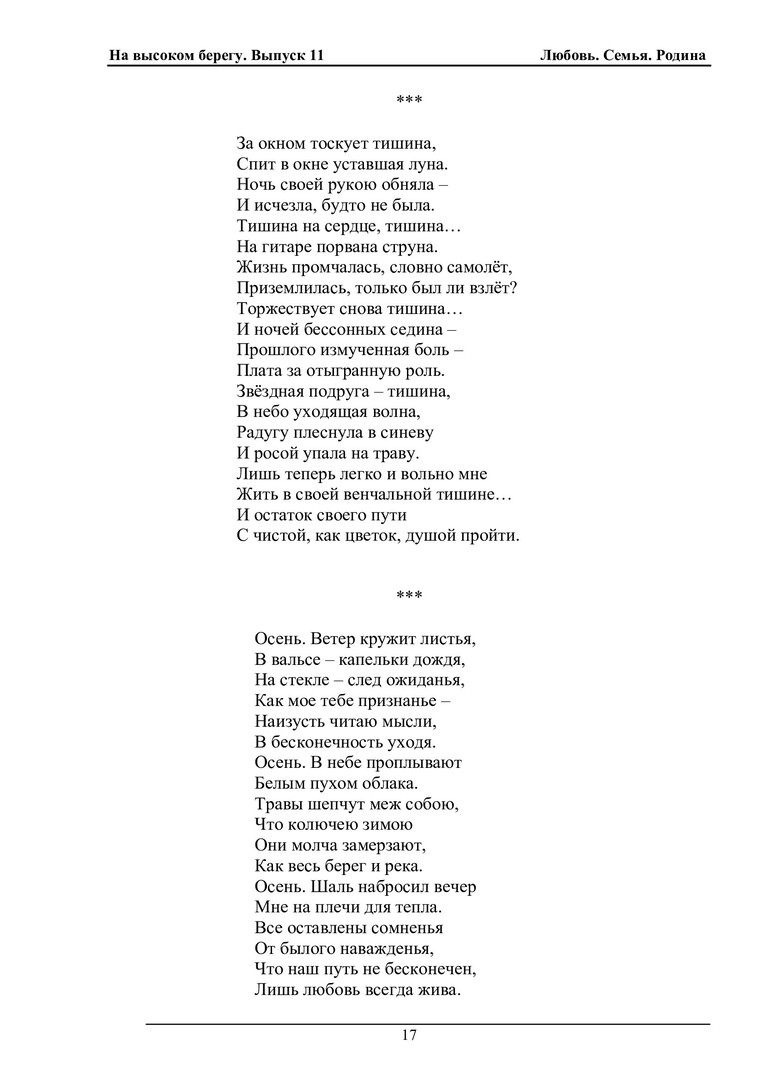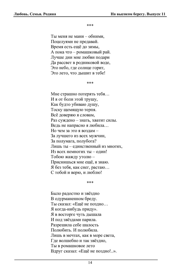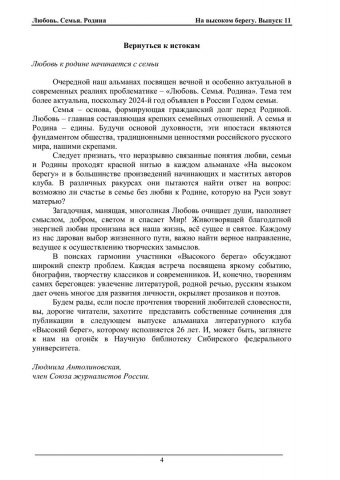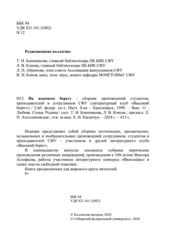 Библиографическое описание:На высоком берегу : сборник произведений студентов, преподавателей и сотрудников СФУ (литературный клуб "Высокий Берег") / Сибирский федеральный университет. - Красноярск : СФУ, 1999 - . - Текст : непосредственный. + Текст : электронный. Вып. 11 : Любовь. Семья. Родина / [сост.: Т. И. Блинникова, Л. В. Конева ; авт. предисл. Л. П. Антолиновская ; отв. за вып. Е. Н. Касянчук]. - 2024. - 412 с. : ил., фот., муз. пр. - : 384.09 р. Посвящается Году семьи