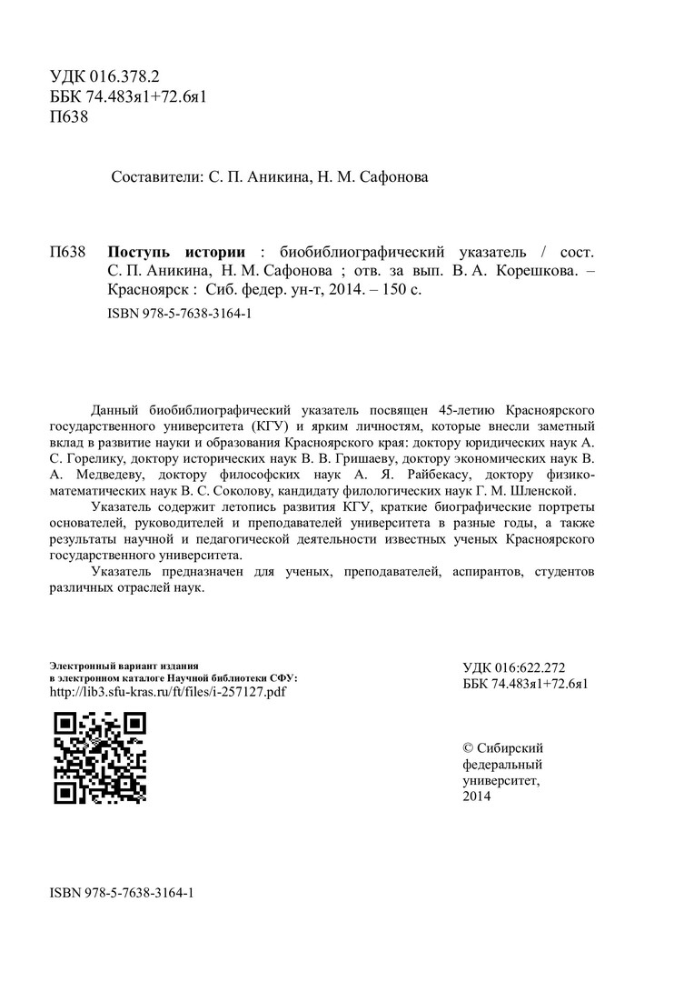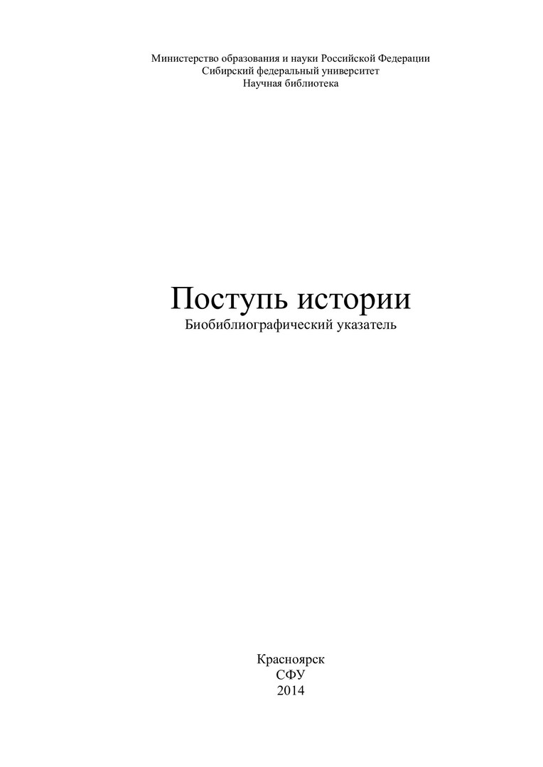 Библиографическое описание: Поступь истории : биобиблиографический указатель / Сибирский федеральный университет, Научная библиотека ; сост.: С. П. Аникина, Н. М. Сафонова ; отв. за вып. В. А. Корешкова. - Красноярск : СФУ, 2014. - 152 с. : ил., портр. - (Биобиблиография ученых СФУ). - Библиогр. в конце разд. - ISBN 978-5-7638-3164-1 : 150 р. - Текст : непосредственный + Текст : электронный.