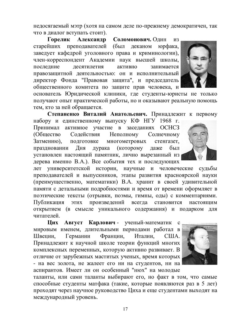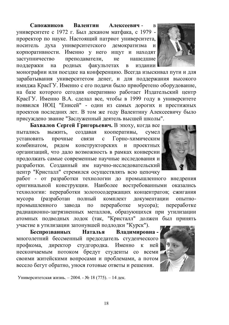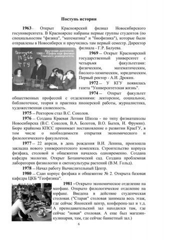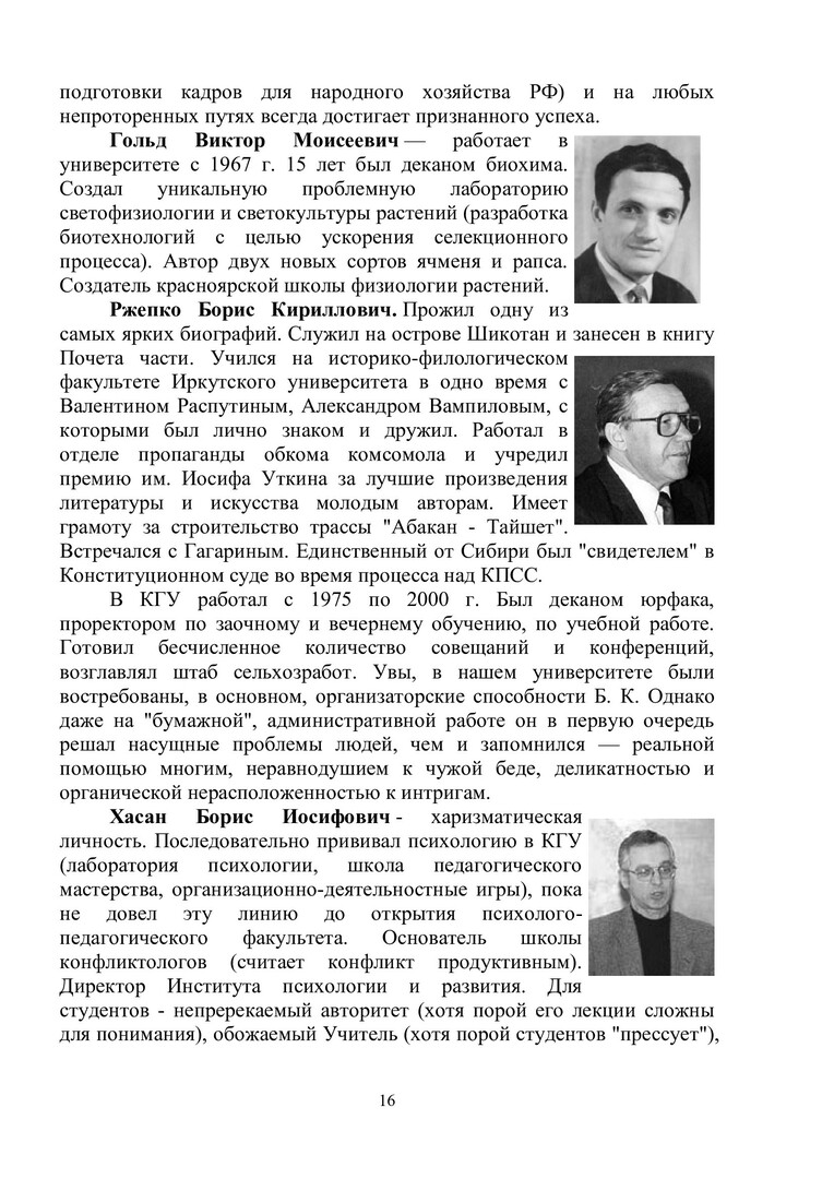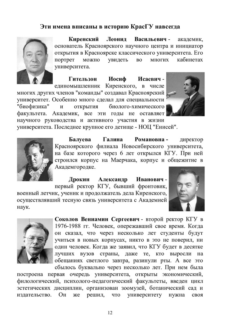 Аннотация: Данный биобиблиографический указатель посвящен 45-летию Красноярского государственного университета (КГУ) и ярким личностям, которые внесли заметный вклад в развитие науки и образования Красноярского края: доктору юридических наук А. С. Горелику, доктору исторических наук В. В. Гришаеву, доктору экономических наук В. А. Медведеву, доктору философских наук А. Я. Райбекасу, доктору физико-математических наук В. С. Соколову, кандидату филологических наук Г. М. Шленской. Указатель содержит летопись развития КГУ, краткие биографические портреты основателей, руководителей и преподавателей университета в разные годы, а также результаты научной и педагогической деятельности известных ученых Красноярского государственного университета. Указатель предназначен для ученых, преподавателей, аспирантов, студентов различных отраслей наук.
