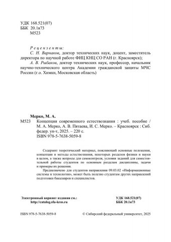 Библиографическое описание: Мерко, Михаил Алексеевич. Концепция современного естествознания : учебное пособие / М. А. Мерко, А. В. Пятаева, И. С. Мерко ; рец.: С. Н. Варнаков, А. В. Рыбаков ; Сибирский федеральный университет, Институт космических и информационных технологий. - Электрон. текстовые дан. (pdf, 1.9 Мб). - Красноярск : СФУ, 2025 (2025-08-25). - 220 с., 13.8 усл. печ. л. : рис., табл., схемы. - Загл. с титул. экрана. - Электрон. версия печ. публикации . - Библиогр.: с. 215-217. - 100 экз. - ISBN 978-5-7638-5059-8 : Б. ц. - Изд. № 2024-22911. - Текст : электронный.