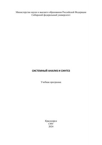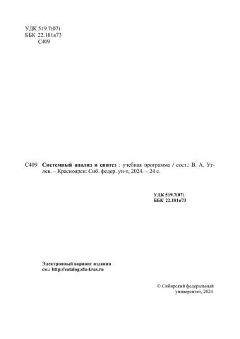 Библиографическое описание:Системный анализ и синтез : учебная программа / сост. В. А. Углев. - Электрон. текстовые дан. (1,5 Мб). - Красноярск : СФУ, 2024 (2024-05-20). - 24 с. : табл. - Загл. с титул. экрана. - Электрон. версия печ. публикации . - 100 экз. - Изд. № 2024-21861 : Б. ц. - Текст : электронный.