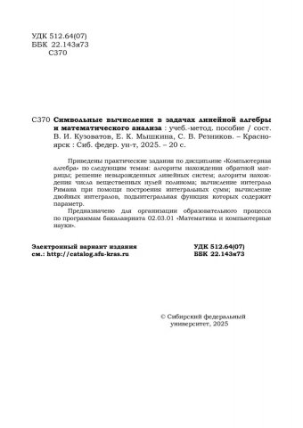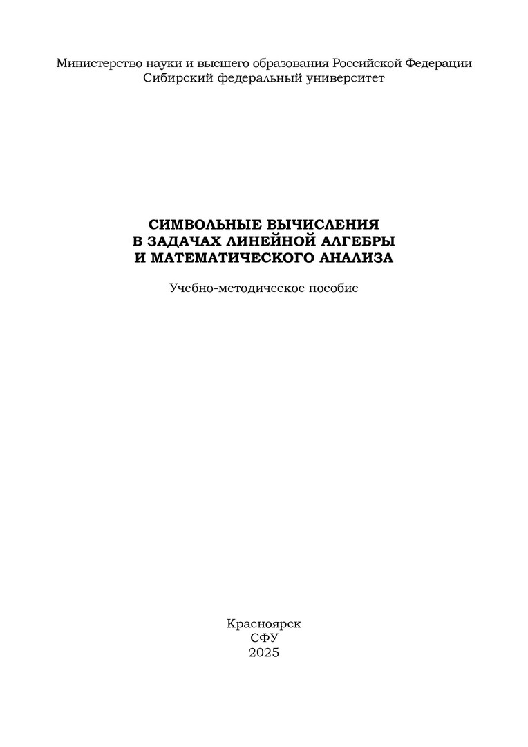 Библиографическое описание: Символьные вычисления в задачах линейной алгебры и математического анализа : учебно-методическое пособие / Сибирский федеральный университет ; [сост.: В. И. Кузоватов, Е. К. Мышкина, С. В. Резников]. - Красноярск : СФУ, 2025 (2025-10-27). - 20 с., 1.0 усл. печ. л. - Библиогр.: с. 18. - 100 экз. - Изд. № 2025-25436 : 18 р. - Текст : электронный + Текст : непосредственный.