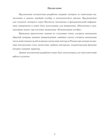 Ключевые слова: символьные вычисления, алгоритм нахождения обратной матрицы, невырожденные линейные системы, решение, формулы Крамера, вещественные нули полинома, интегралы Римана, вычисление, двойные интегралы, вычисление