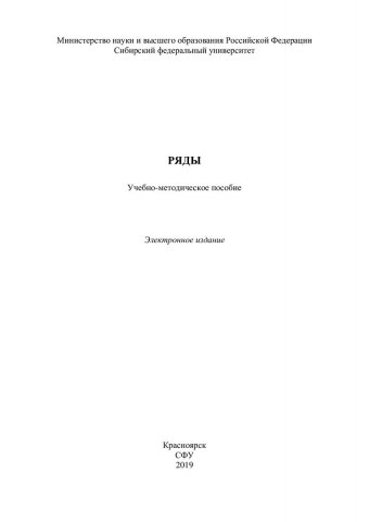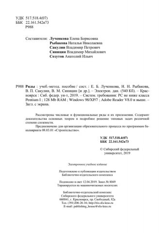 Библиографическое описание: Ряды : учебно-методическое пособие / Сиб. федер. ун-т, Ин-т математики и фундамент. информатики ; сост. Е. Б. Лученкова [и др.]. - Электрон. текстовые дан. (pdf, 1 Мб). - Красноярск : СФУ, 2019. - Загл. с титул. экрана. - Библиогр.: с. 78. - Изд. № 2019-8049 : Б. ц. - Текст : электронный.
