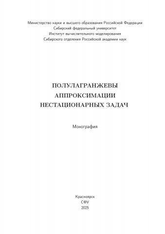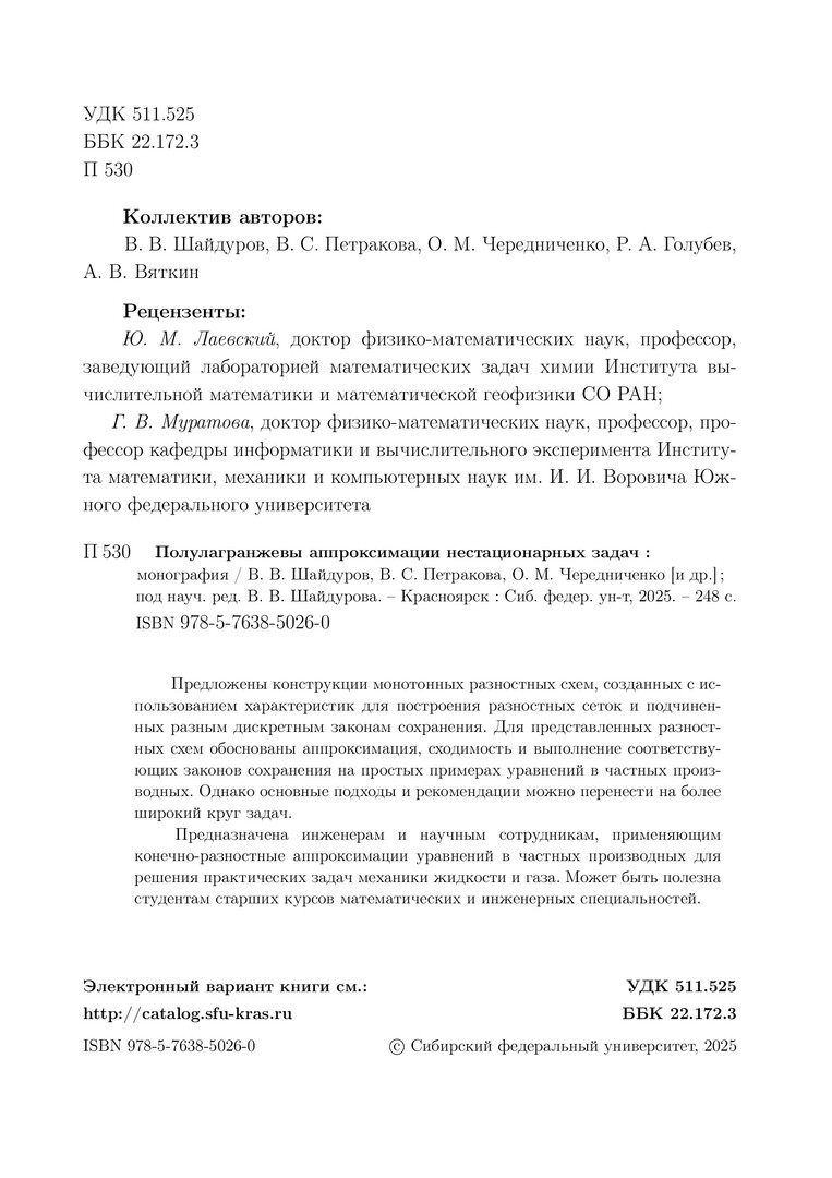Библиографическое описание: Полулагранжевы аппроксимации нестационарных задач : монография / В. В. Шайдуров, В. С. Петракова, О. М. Чередниченко [и др.] ; рец.: Ю. М. Лаевский, Г. В. Муратова ; Сибирский федеральный университет, Институт математики и фундаментальной информатики, Российская академия наук, Сибирское отделение, Институт вычислительного моделирования. - Электрон. текстовые дан. (2,5 Мб). - Красноярск : СФУ, 2025 (2025-01-24). - 248 с., 15.5 усл. печ. л. - Загл. с титул. экрана. - Электрон. версия печ. публикации . - Библиогр.: с. 241-245. - 500 экз. - ISBN 978-5-7638-5026-0 : Б. ц. - Изд. № 2024-22272. - Текст : электронный.