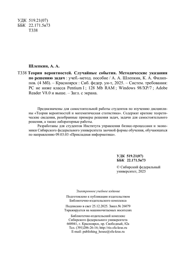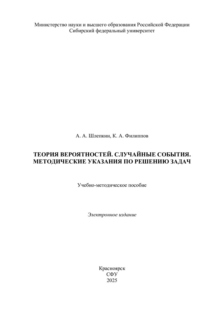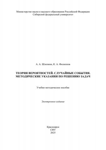 Библиографическое описание:Шлепкин, Алексей Анатольевич. Теория вероятностей. Случайные события. Методические указания по решению задач : учебно-методическое пособие / А. А. Шлепкин, К. А. Филиппов ; Сиб. федер. ун-т, Ин-т космич. и информ. технологий. - Электрон. текстовые дан. (pdf, 3.8 Мб). - Красноярск : СФУ, 2025 (2025-12-25). - 28 с. - Загл. с титул. экрана. - Изд. № 2026-26079 : Б. ц. - Текст : электронный.