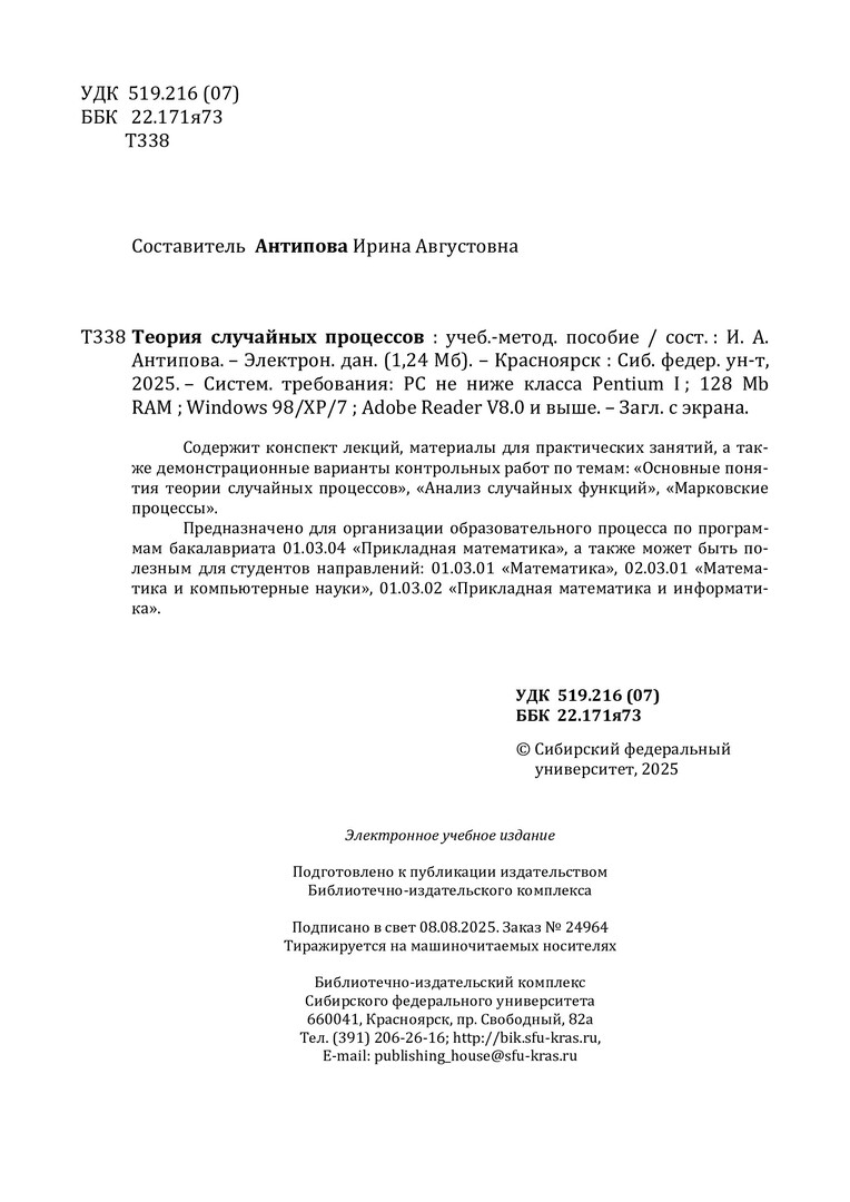 Библиографическое описание: Теория случайных процессов : учебно-методическое пособие / Сибирский федеральный университет, Институт космических и информационных технологий ; сост. И. А. Антипова. - Электрон. текстовые дан. (pdf, 1,3 Мб). - Красноярск : СФУ, 2025 (2025-08-08). - 50 с. - Загл. с титул. экрана. - Библиогр.: с. 50. - Изд. № 2025-24964 : Б. ц. - Текст : электронный.