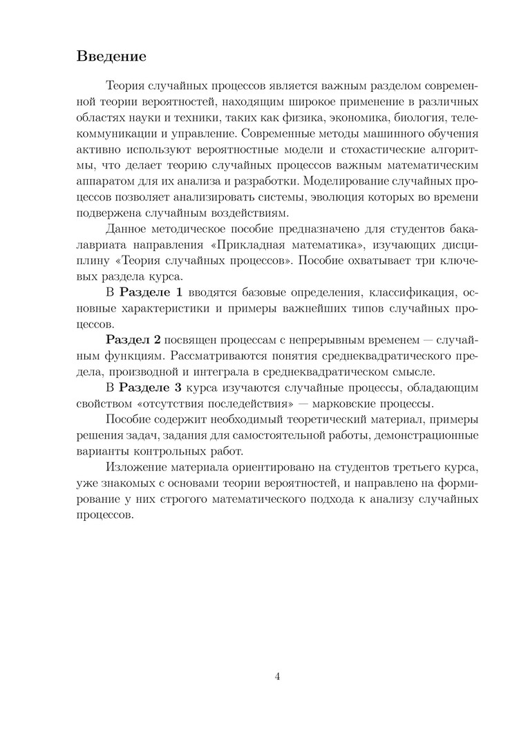 Аннотация: Содержит конспект лекций, материалы для практических занятий, а также демонстрационные варианты контрольных работ по темам: «Основные понятия теории случайных процессов», «Анализ случайных функций», «Марковские процессы». Предназначено для организации образовательного процесса по программам бакалавриата 01.03.04 «Прикладная математика», а также может быть полезным для студентов направлений: 01.03.01 «Математика», 02.03.01 «Математика и компьютерные науки», 01.03.02 «Прикладная математика и информатика».