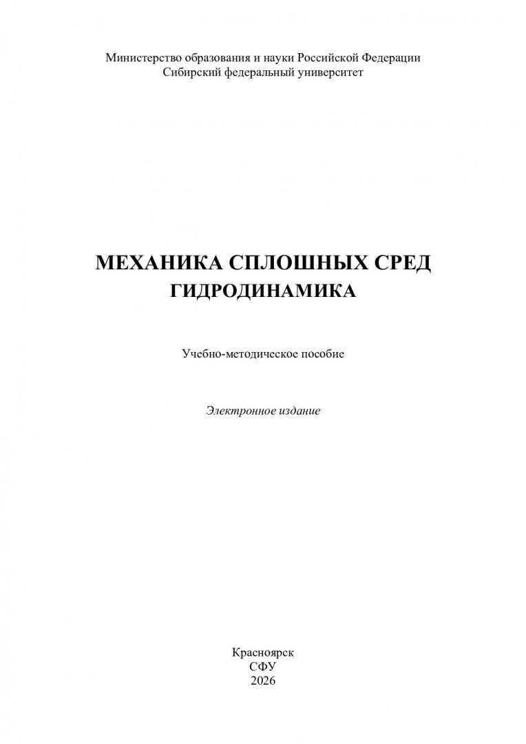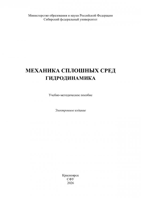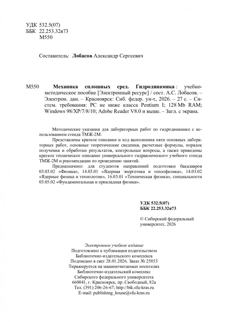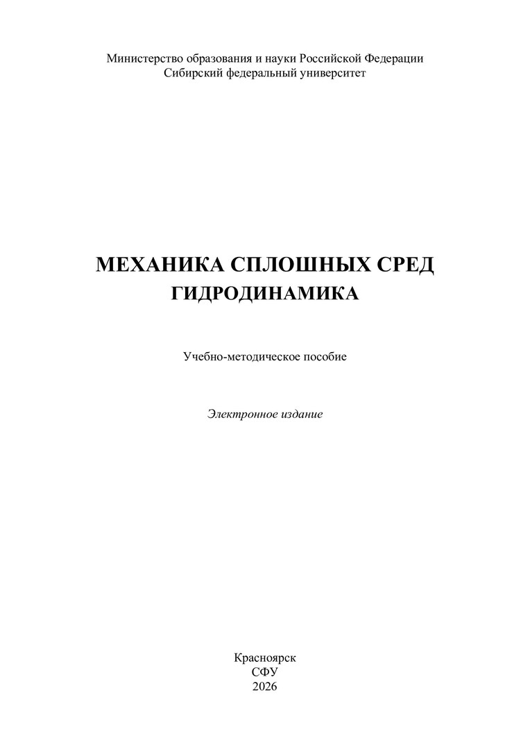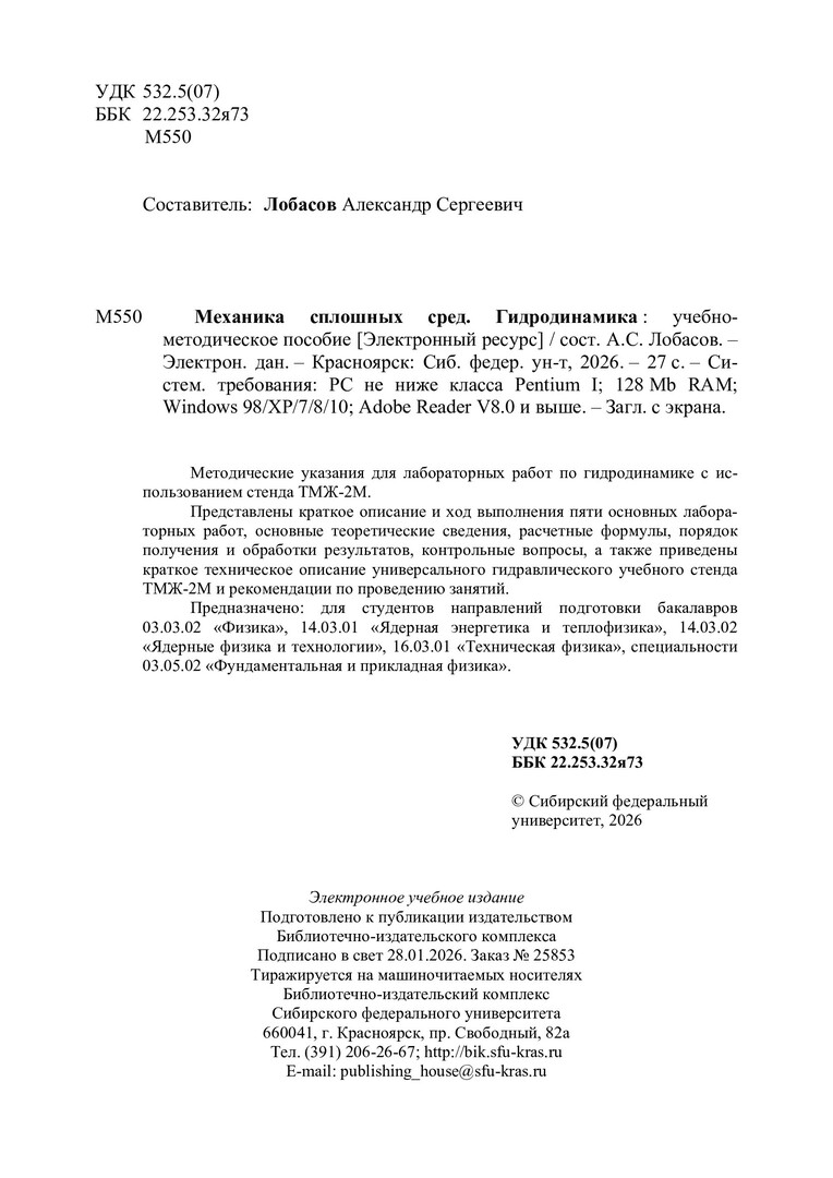 Библиографическое описание: Механика сплошных сред. Гидродинамика : [лабораторные работы] : учебно-методическое пособие / Сибирский федеральный университет, Институт инженерной физики и радиоэлектроники ; сост. А. С. Лобасов. - Электрон. текстовые дан. (pdf, 1.9 Мб). - Красноярск : СФУ, 2026 (2026-01-28). - 27 с. : ил., схемы, табл. - Загл. с титул. экрана. - Библиогр.: с. 27. - Изд. № 2025-25853 : Б. ц. - Текст : электронный.