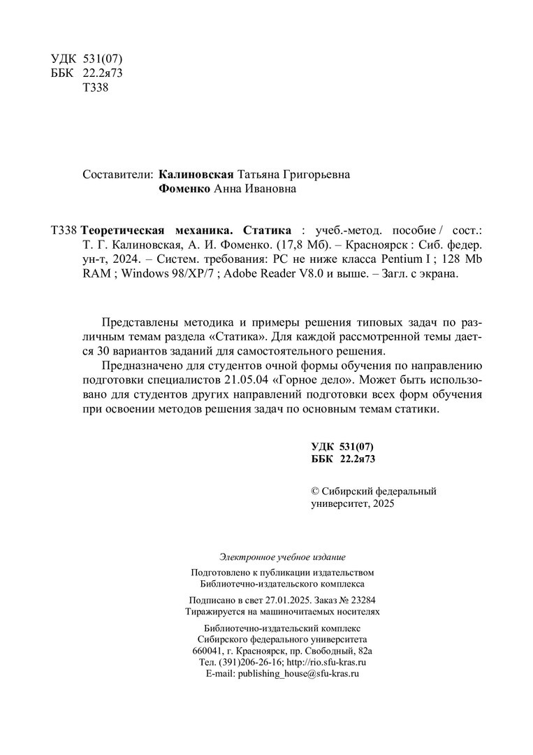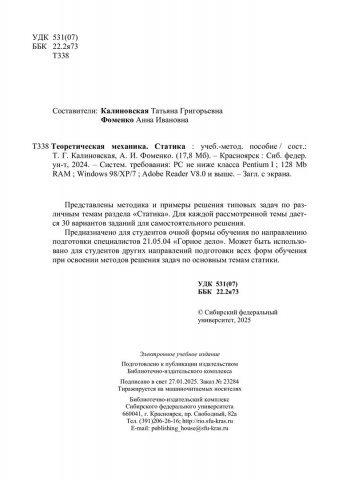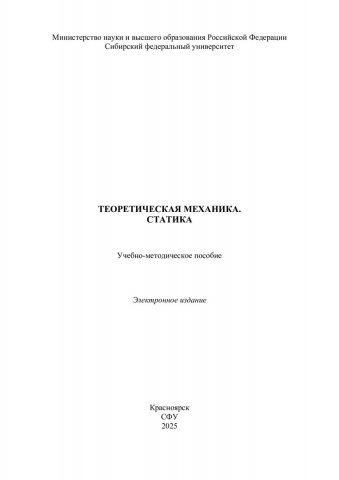 Библиографическое описание: Теоретическая механика. Статика : учебно-методическое пособие / Сибирский федеральный университет, Институт цветных металлов ; сост.: Т. Г. Калиновская, А. И. Фоменко. - Электрон. текстовые дан. (pdf, 20,3 Мб). - Красноярск : СФУ, 2025 (2025-01-27). - 55 с. - Загл. с титул. экрана. - Библиогр.: с. 55. - Изд. № 2024-23473 : Б. ц. - Текст : электронный.