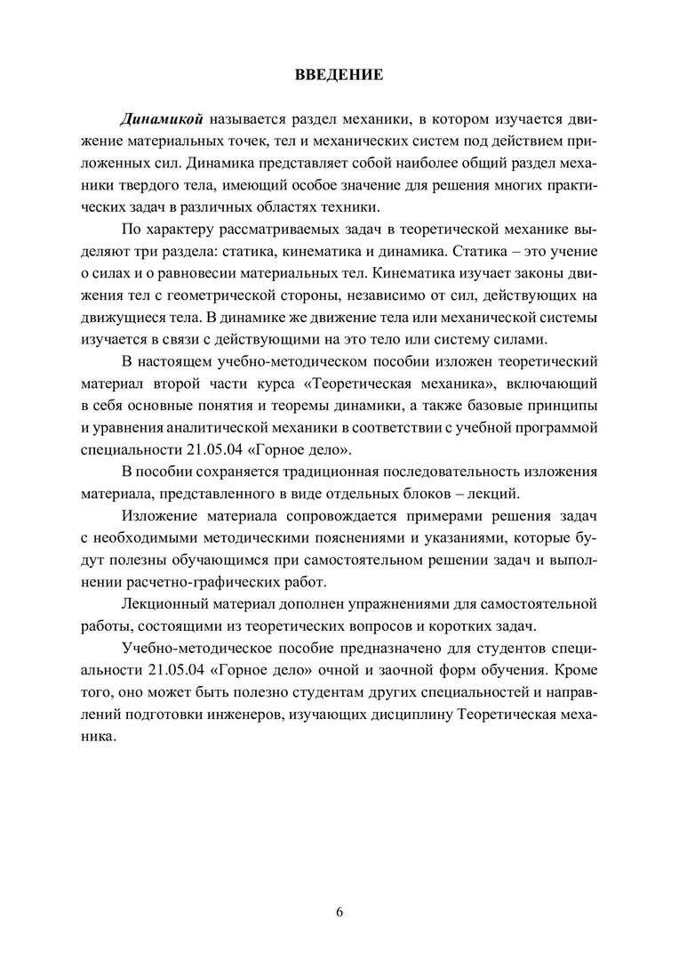 Аннотация: Изложен теоретический материал II части курса «Теоретическая механика», раздела «Динамика» в форме конспекта лекций, дополненный большим количеством примеров решения задач. В конце каждой лекции приведены контрольные вопросы и задания для самопроверки усвоения учебного материала. Пособие предназначено для студентов специальности 21.05.04 «Горное дело», а также других специальностей и направлений подготовки инженеров, изучающих дисциплину Теоретическая механика.