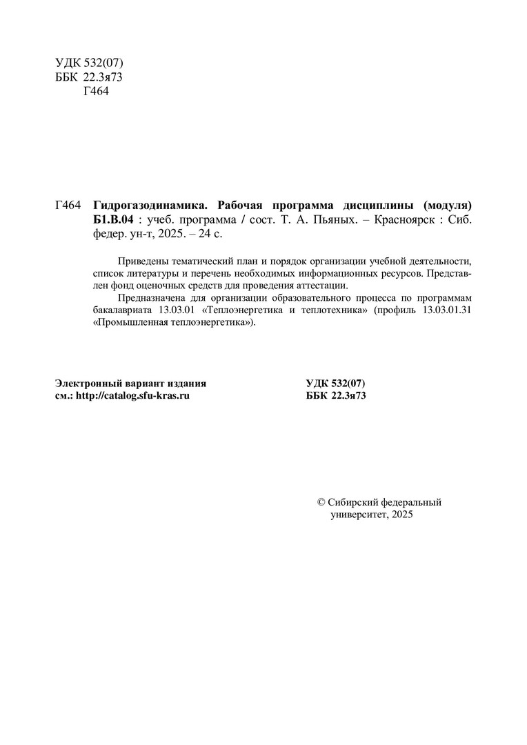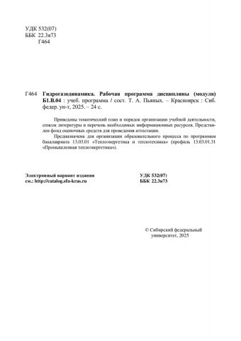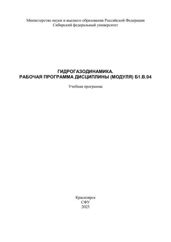 Библиографическое описание:Гидрогазодинамика. Рабочая программа дисциплины (модуля) Б1.В.04 : учебная программа / Сибирский федеральный университет, Политехнический институт ; сост. Т. А. Пьяных. - Электрон. текстовые дан. (1,0 Мб). - Красноярск : СФУ, 2025 (2025-03-17). - 24 с., 1.0 усл. печ. л. - Загл. с титул. экрана. - Электрон. версия печ. публикации . - Библиогр.: с. 15-16. - 100 экз. - Изд. № 2025-23944 : Б. ц. - Текст : электронный.