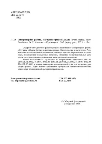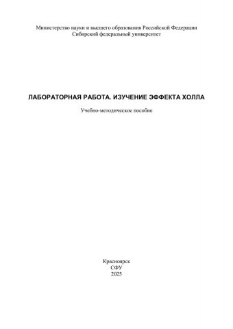 Библиографическое описание: Лабораторная работа. Изучение эффекта Холла : [лабораторная работа]: учебно-методическое пособие / Сибирский федеральный университет ; сост. О. С. Иванова. - Электрон. текстовые дан. (0,9 Мб). - Красноярск : СФУ, 2025 (2025-03-06). - 12 с. : ил., цв. ил., табл. - Загл. с титул. экрана. - Электрон. версия печ. публикации . - Библиогр.: с. 10. - 100 экз. - Изд. № 2025-23837 : Б. ц. - Текст : электронный.