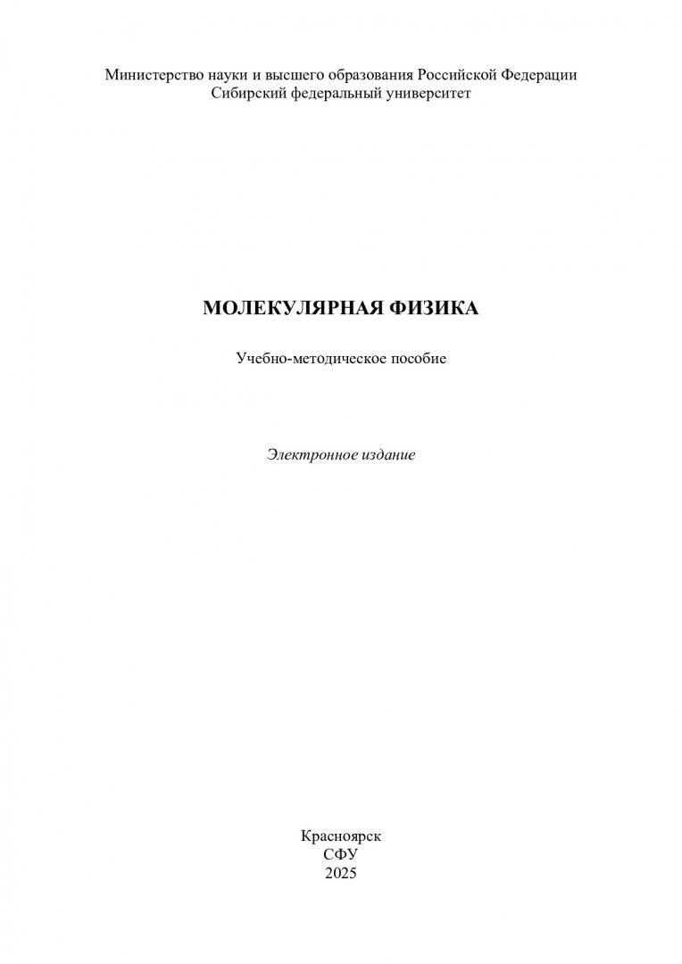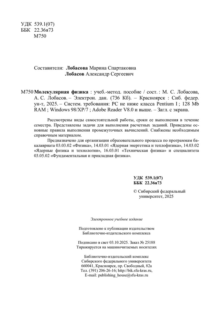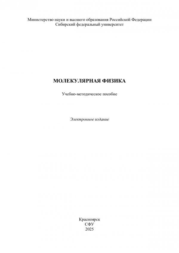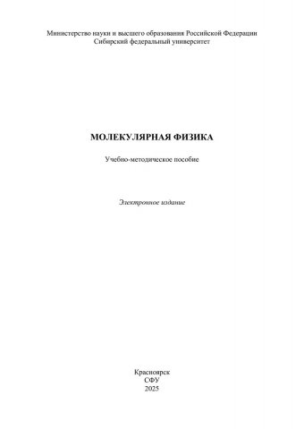 Библиографическое описание: Молекулярная физика : учебно-методическое пособие / Сибирский федеральный университет, Институт инженерной физики и радиоэлектроники ; сост.: М. С. Лобасова, А. С. Лобасов. - Электрон. текстовые дан. (pdf, 0.8 Мб) . - Красноярск : СФУ, 2025 (2025-10-03). - 49 с. : табл. - Загл. с титул. экрана. - Библиогр.: с. 48. - Изд. № 2025-25188 : Б. ц. - Текст : электронный.