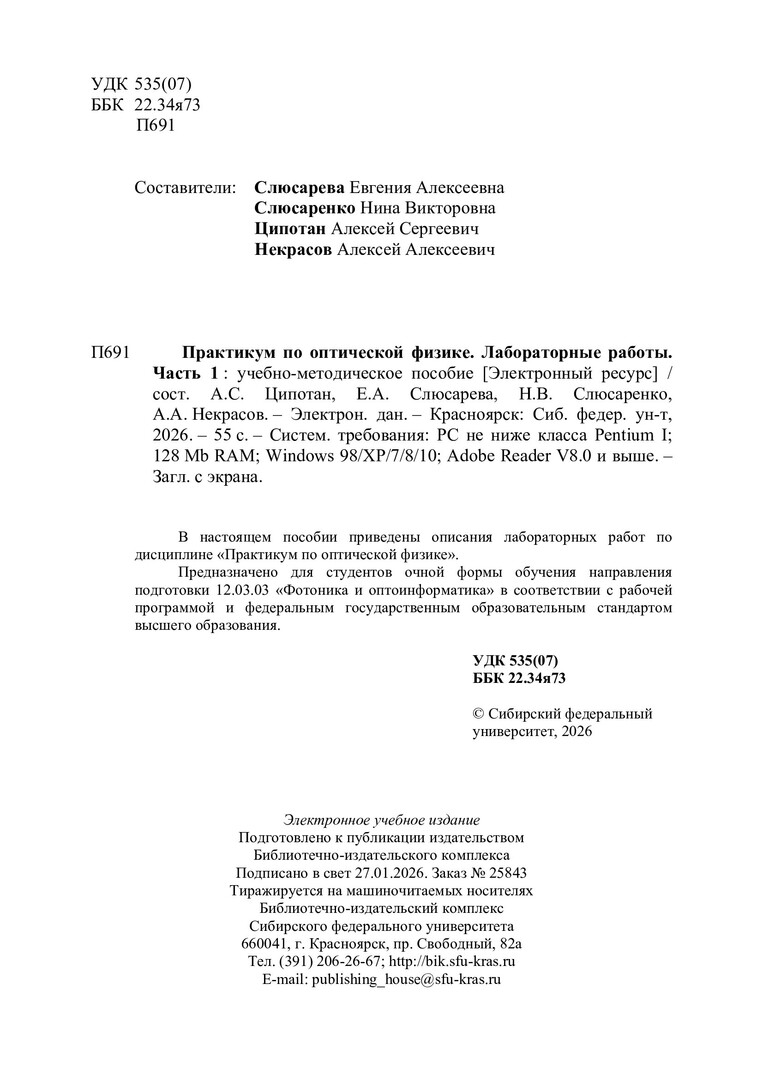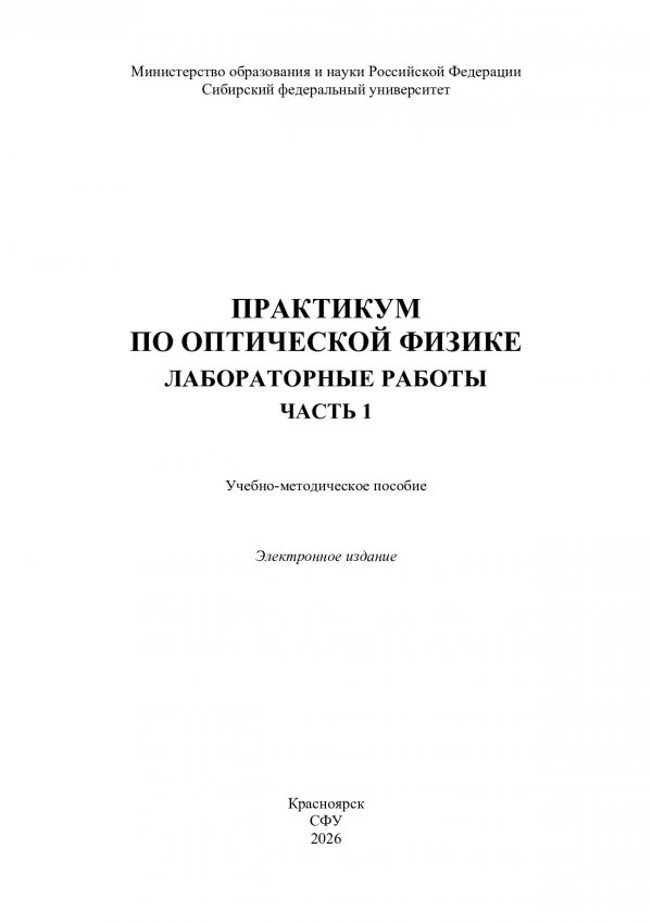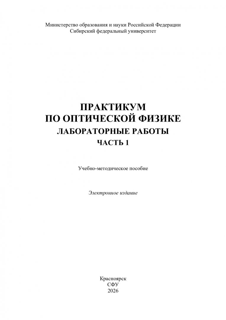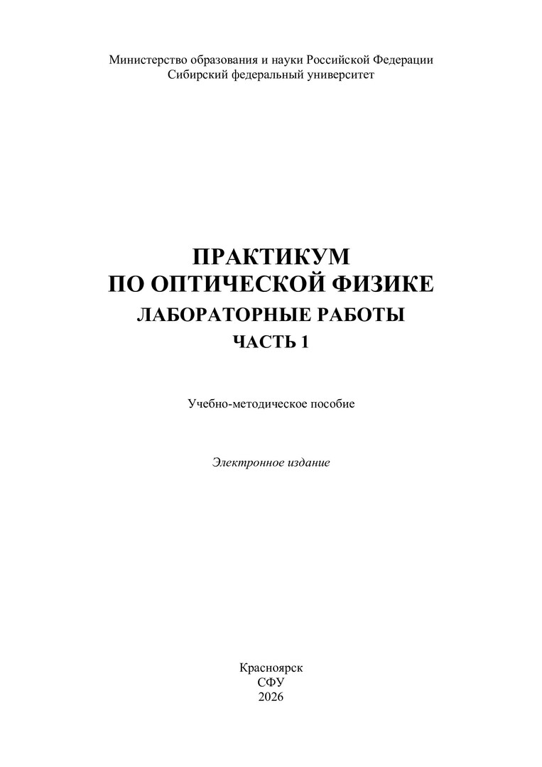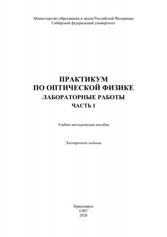 Библиографическое описание:Практикум по оптической физике. Лабораторные работы. : учебно-методическое пособие / Сибирский федеральный университет, Институт инженерной физики и радиоэлектроники. - Электрон. текстовые дан. (pdf, 2.6 Мб). - Красноярск : СФУ, 2026 - . - Загл. с титул. экрана. - Текст : электронный. Ч. 1 / сост.: Е. А. Слюсарева, Н. В. Слюсаренко, А. С. Ципотан, А. А. Некрасов. - 2026 (2026-01-27). - 55 с. : рис., табл. - Библиогр. в конце работ. - Изд. № 2025-25843 : Б. ц.