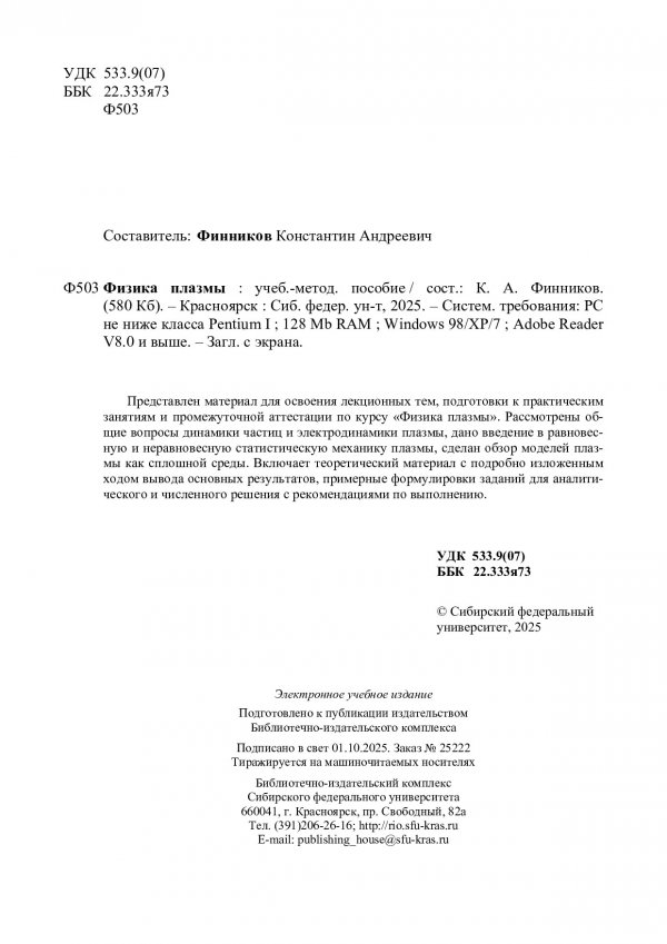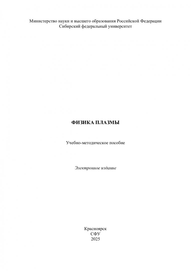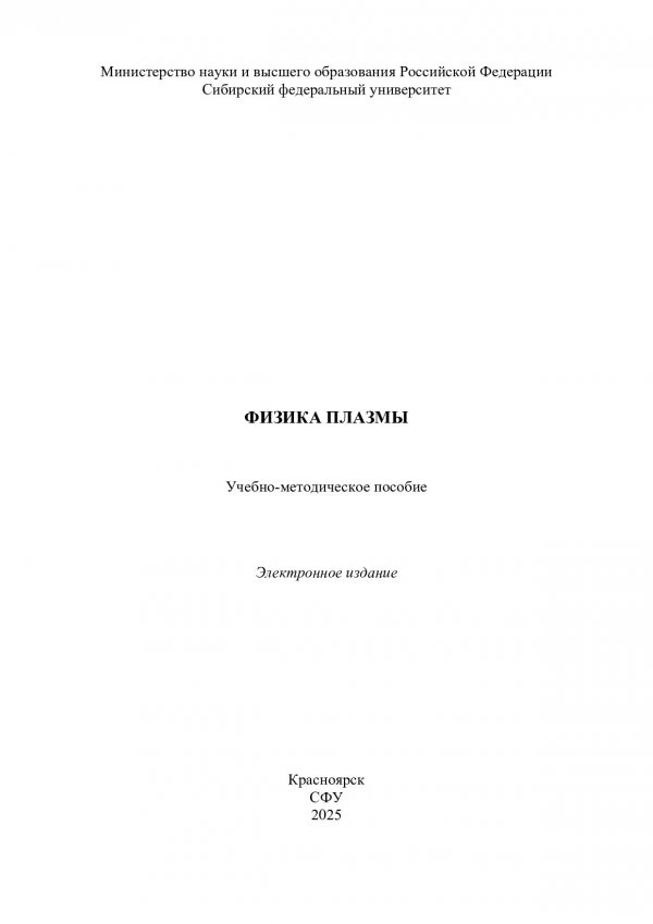 Библиографическое описание: Физика плазмы : учебно-методическое пособие / Сибирский федеральный университет, Институт инженерной физики и радиоэлектроники ; сост. К. А. Финников. - Электрон. текстовые дан. (pdf, 3.9 Мб). - Красноярск : СФУ, 2025 (2025-10-01). - 102 с. - Загл. с титул. экрана. - Библиогр.: с. 102. - Изд. № 2025-25222 : Б. ц. - Текст : электронный.