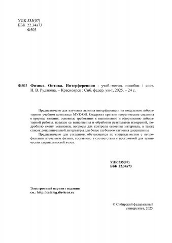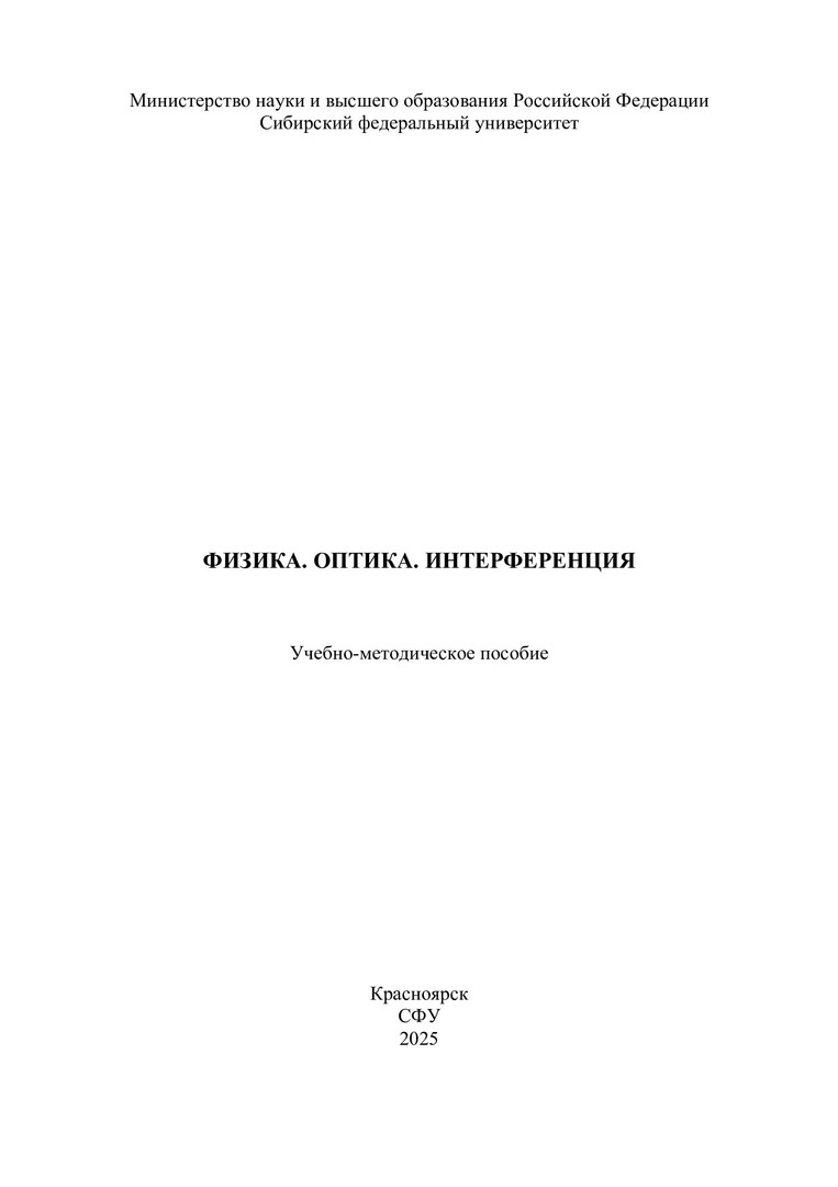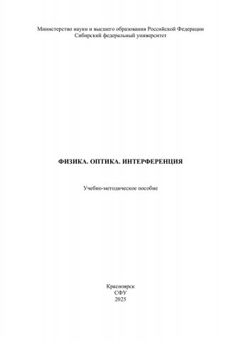 Библиографическое описание: Физика. Оптика. Интерференция : учебно-методическое пособие / Сибирский федеральный университет ; сост. Н. В. Рудакова. - Электрон. текстовые дан. (pdf, 4.2 Мб). - Красноярск : СФУ, 2025 (2025-06-20). - 24 с. : граф., рис., табл. - Загл. с титул. экрана. - Электрон. версия печ. публикации . - Библиогр. в конце разд. - 100 экз. - Изд. № 2025-24595 : Б. ц. - Текст : электронный.