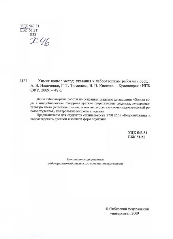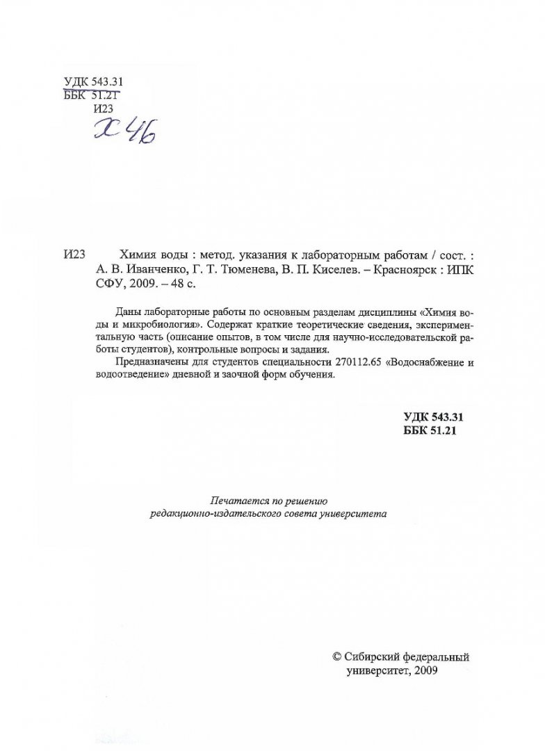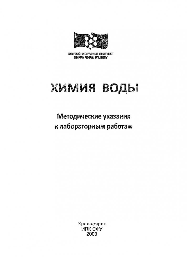 Библиографическое описание:Химия воды : метод. указания к лаб. работам / Сиб. федер. ун-т, Инж.-строит. ин-т ; сост. А. В. Иванченко, Г. Т. Тюменева, В. П. Киселев. - Красноярск : ИПК СФУ, 2009. - 48 с.