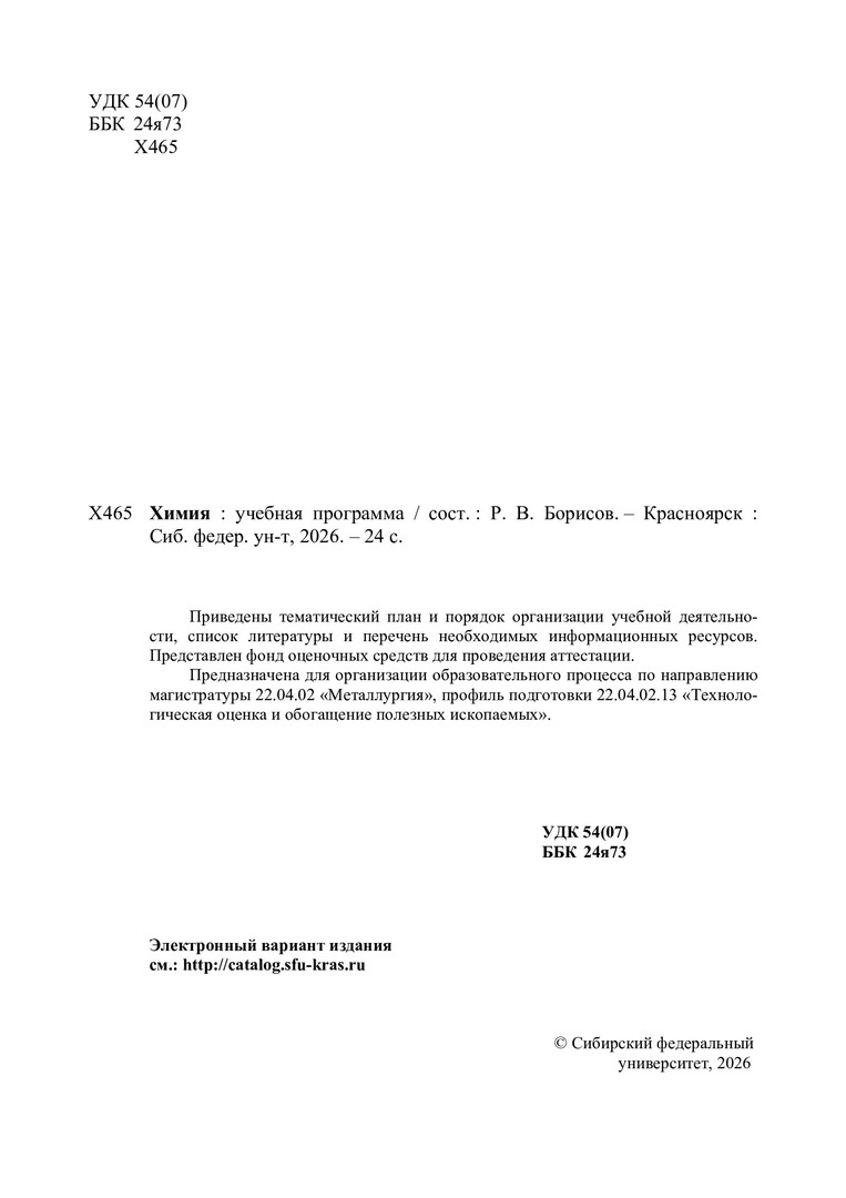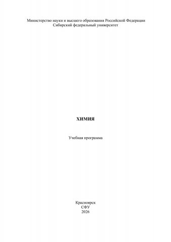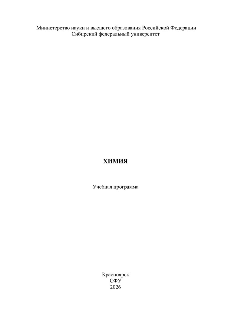 Библиографическое описание:Химия : учебная программа / Сибирский федеральный университет ; сост. Р. В. Борисов. - Электрон. текстовые дан. (pdf, 0.6 Мб). - Красноярск : СФУ, 2026 (2026-02-20). - 24 с. : табл. - Загл. с титул. экрана. - Электрон. версия печ. публикации . - Библиогр.: с. 16. - 2 экз. - Изд. № 2026-26170 : Б. ц. - Текст : электронный.