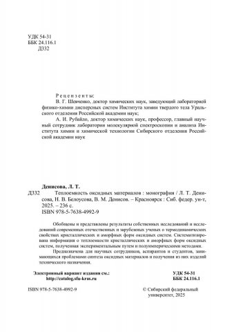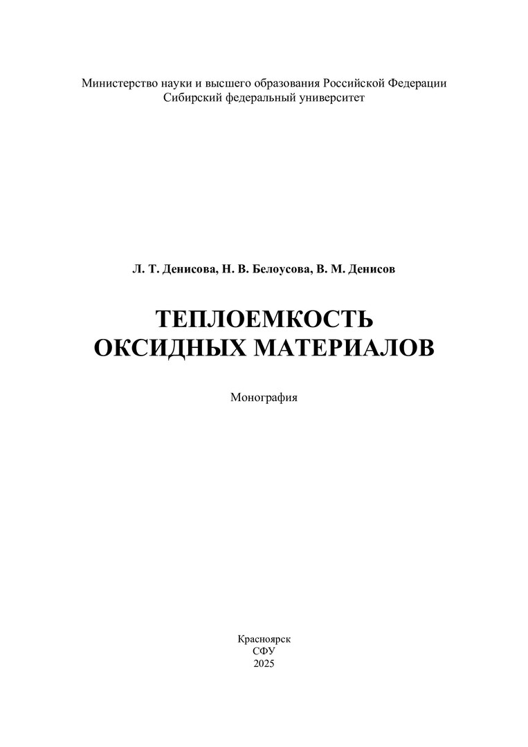 Библиографическое описание: Денисова, Любовь Тимофеевна. Теплоемкость оксидных материалов : монография / Л. Т. Денисова, Н. В. Белоусова, В. М. Денисов ; рец.: В. Г. Шевченко, А. И. Рубайло ; Сибирский федеральный университет, Институт цветных металлов. - Электрон. текстовые дан. (pdf ; 6,1 Мб). - Красноярск : СФУ, 2025 (2025-06-16). - 236 с., 14.8 усл. печ. л. : граф., табл. - Загл. с титул. экрана. - Электрон. версия печ. публикации . - Библиогр.: с. 162-208. - 500 экз. - ISBN 978-5-7638-4992-9 : Б. ц. - Изд. № 2024-21504. - Текст : электронный.