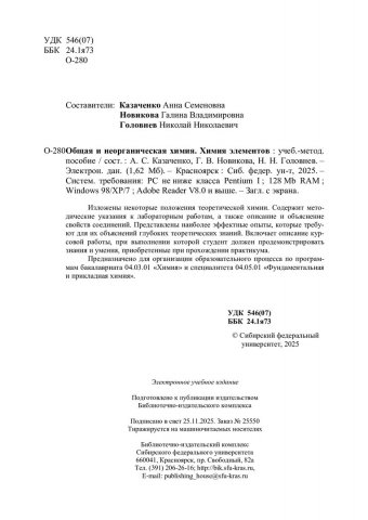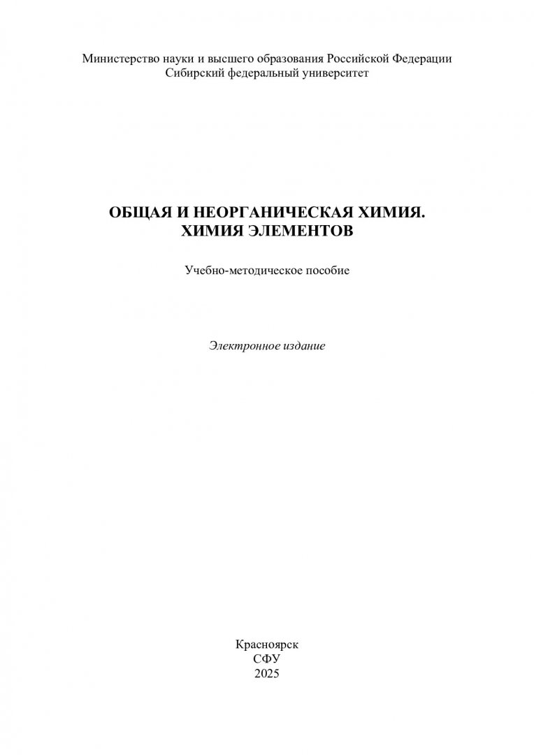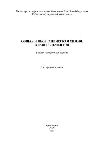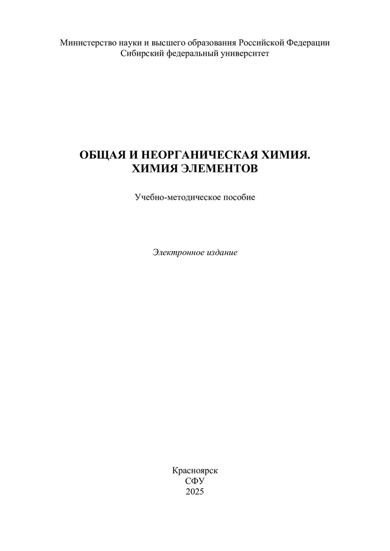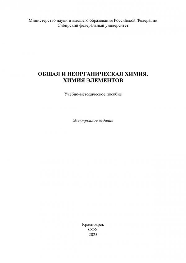Библиографическое описание: Общая и неорганическая химия. Химия элементов : учебно-методическое пособие / Сибирский федеральный университет, Институт цветных металлов ; сост.: А. С. Казаченко, Г. В. Новикова, Н. Н. Головнев. - Электрон. текстовые дан. (pdf, 1.8 Мб). - Красноярск : СФУ, 2025 (2025-11-25). - 134 с. : ил., табл. - Загл. с титул. экрана. - Библиогр.: с. 132. - Изд. № 2025-25550 : Б. ц. - Текст : электронный.