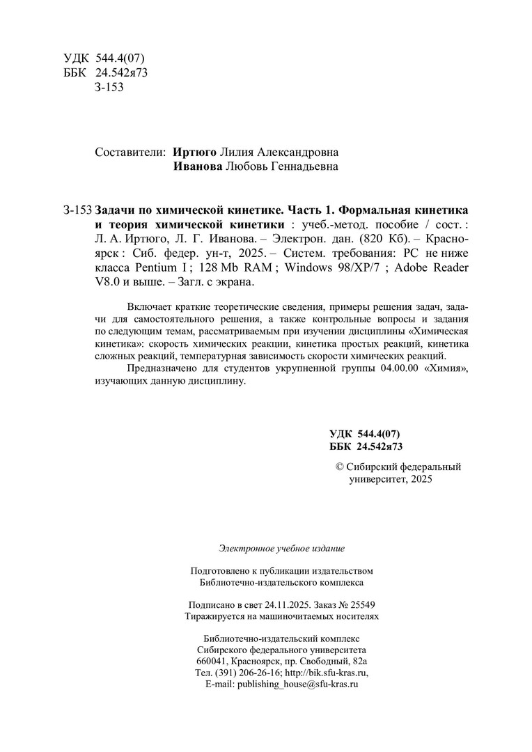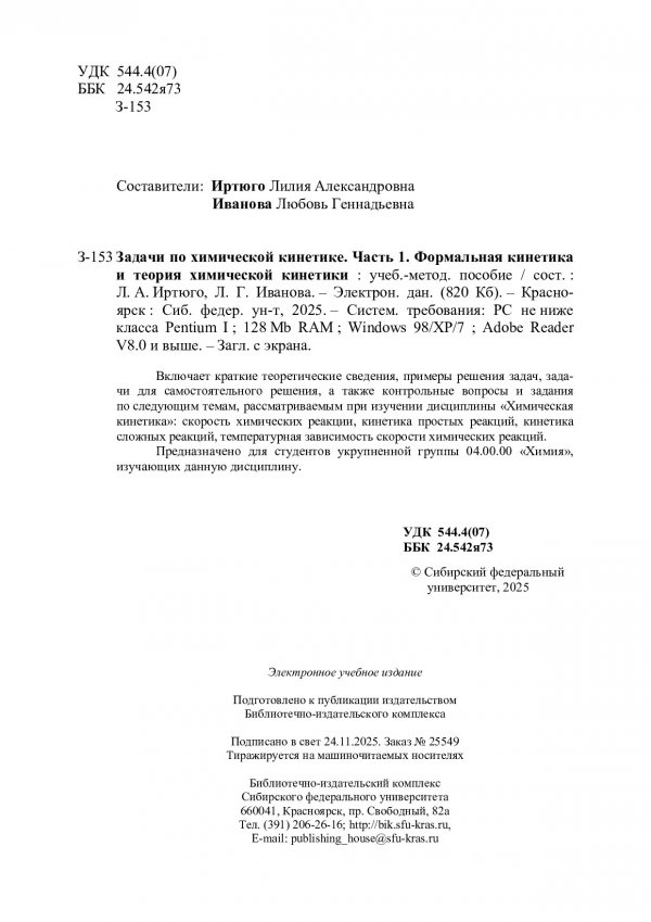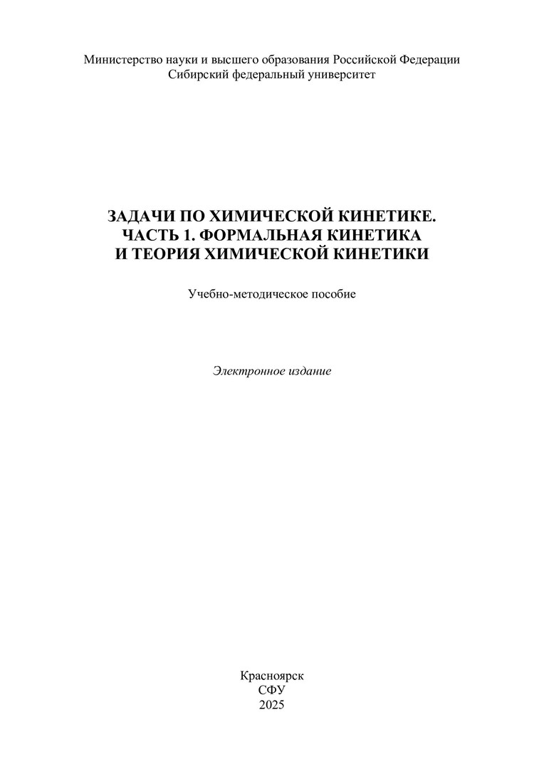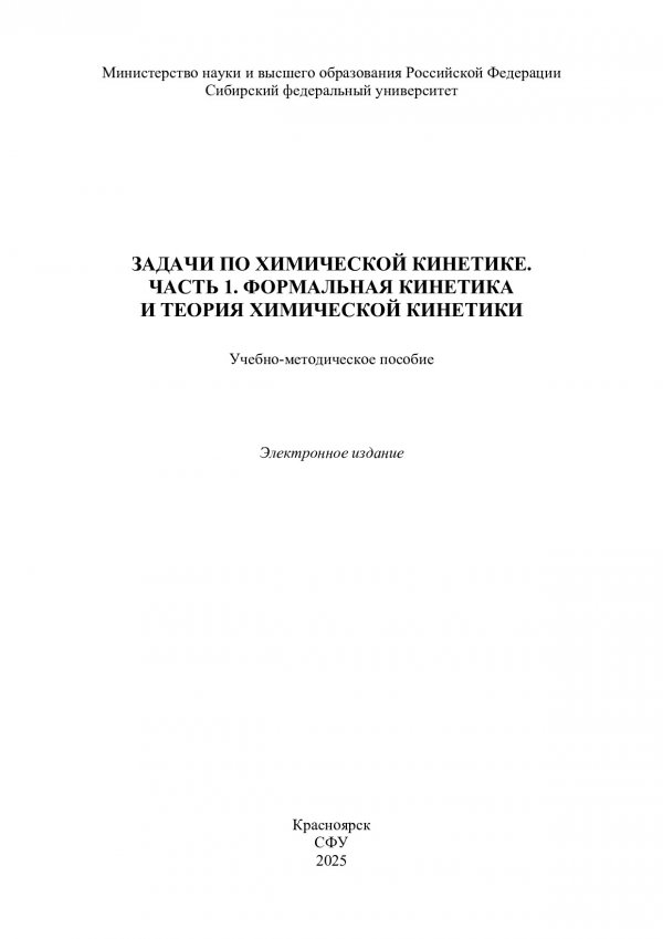 Библиографическое описание:Задачи по химической кинетике : учебно-методическое пособие / Сибирский федеральный университет, Институт цветных металлов; сост.: Л. А. Иртюго, Л. Г. Иванова. - Электрон. текстовые дан. (pdf, 0.9 Мб). - Красноярск : СФУ, 2025 - . - Загл. с титул. экрана. - Текст : электронный. Ч. 1. : Формальная кинетика и теория химической кинетики. - 2025 (2025-11-24). - 68 с. : граф., табл. - Библиогр.: с. 68. - Изд. № 2025-25549 : Б. ц.