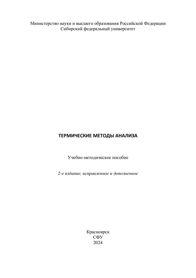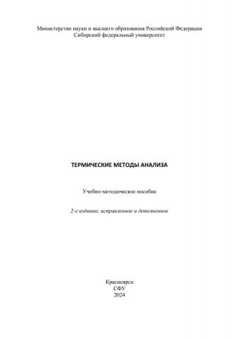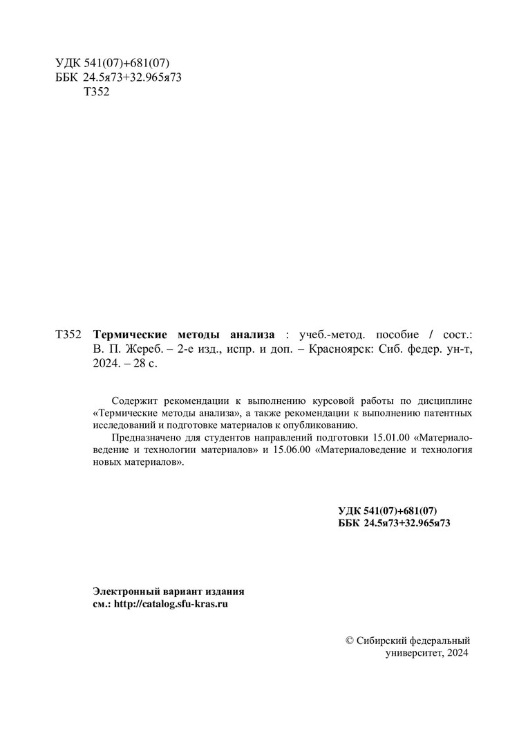 Библиографическое описание:Термические методы анализа : учебно-методическое пособие [к выполнению курсовой работы] / Сибирский федеральный университет ; сост. В. П. Жереб. - 2-е изд., испр. и доп. - Электрон. текстовые дан. (1,3 Мб). - Красноярск : СФУ, 2024. - 28 с. : граф. - Загл. с титул. экрана. - Электрон. версия печ. публикации . - 100 экз. - Изд. № 2024-22399 : Б. ц. - Текст : электронный.
