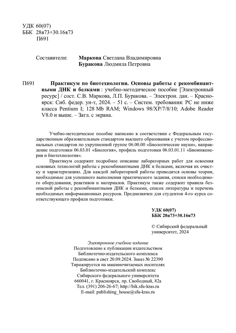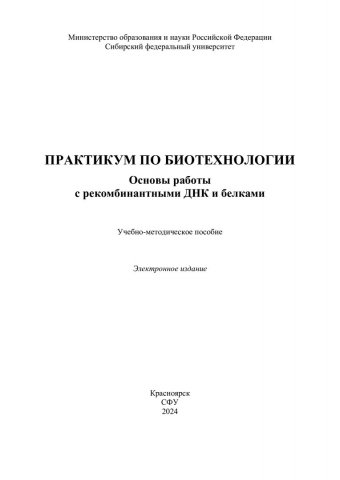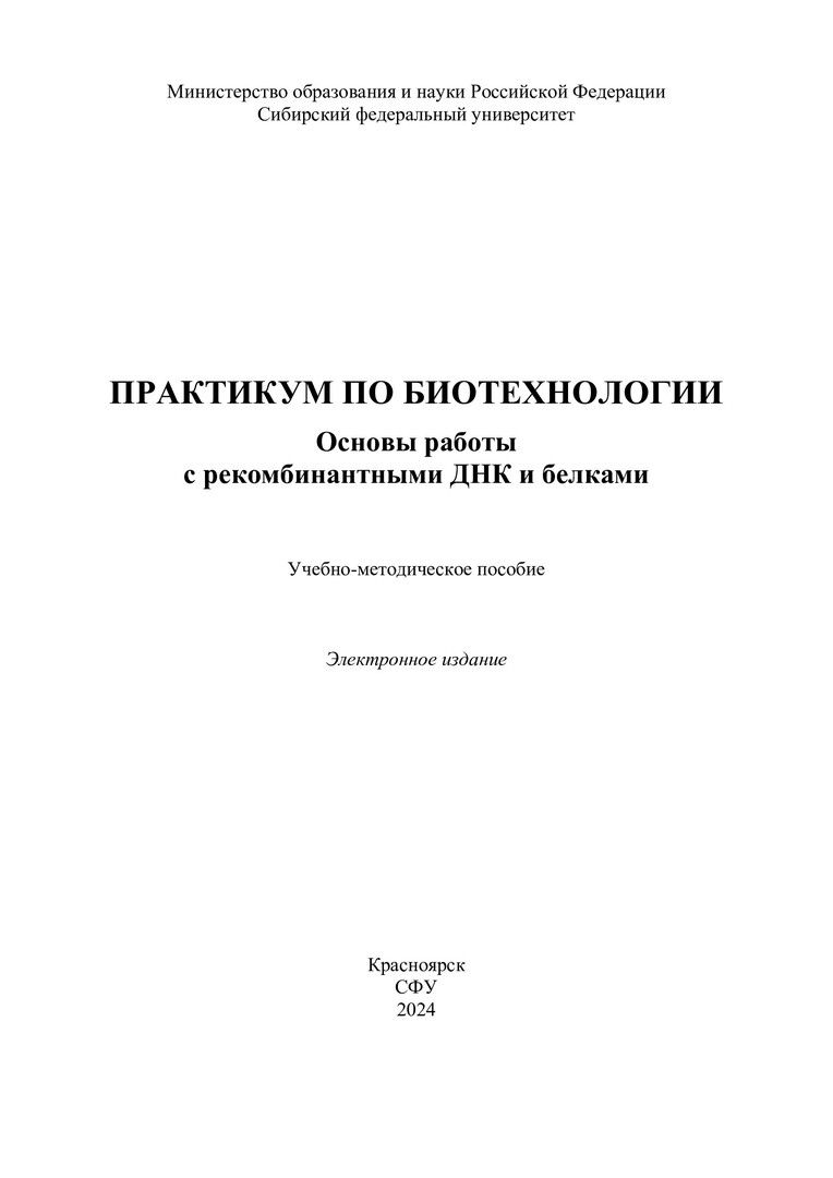 Библиографическое описание: Практикум по биотехнологии. Основы работы с рекомбинантными ДНК и белками [лабораторные работы] : учебно-методическое пособие / Сибирский федеральный университет, Институт фундаментальной биологии и биотехнологии ; сост.: С. В. Маркова, Л. П. Буракова. - Электрон. текстовые дан. (2,2 Мб). - Красноярск : СФУ, 2024. - 51 с. : ил. - Загл. с титул. экрана. - Библиогр.: с. 51. - Изд. № 2024-22390 : Б. ц. - Текст : электронный.