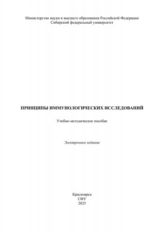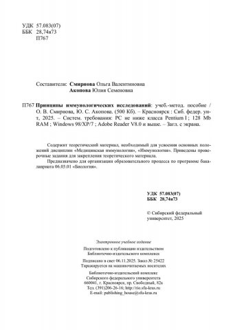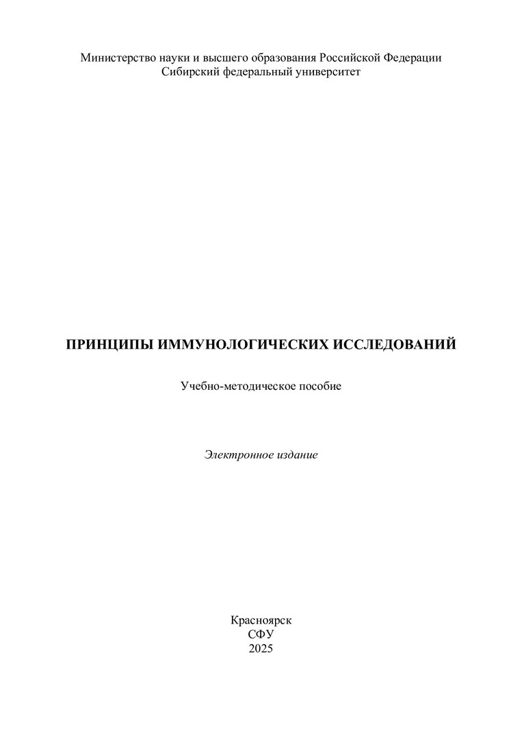 Библиографическое описание: Принципы иммунологических исследований : учебно-методическое пособие / Сибирский федеральный университет, Институт фундаментальной биологии и биотехнологии ; сост.: О. В. Смирнова, Ю. С. Акопова. - Электрон. текстовые дан. (pdf, 2.4 Мб). - Красноярск : СФУ, 2025 (2025-11-06). - 65 с. - Загл. с титул. экрана. - Библиогр.: с. 64-65. - Изд. № 2025-25422 : Б. ц. - Текст : электронный.