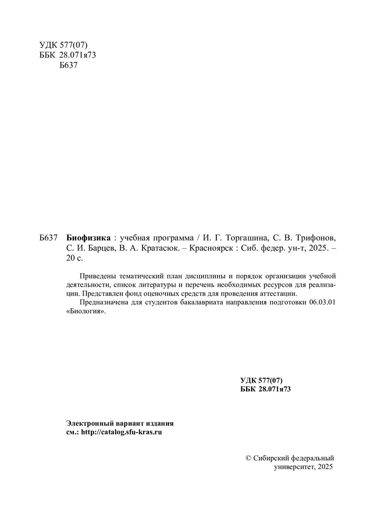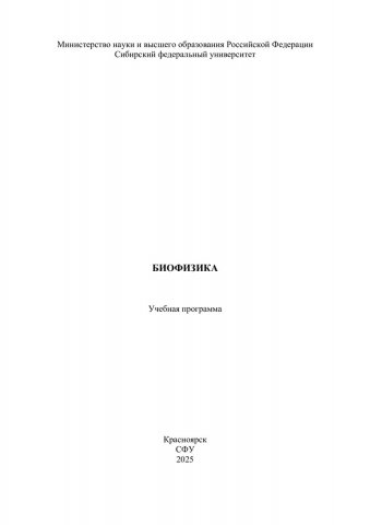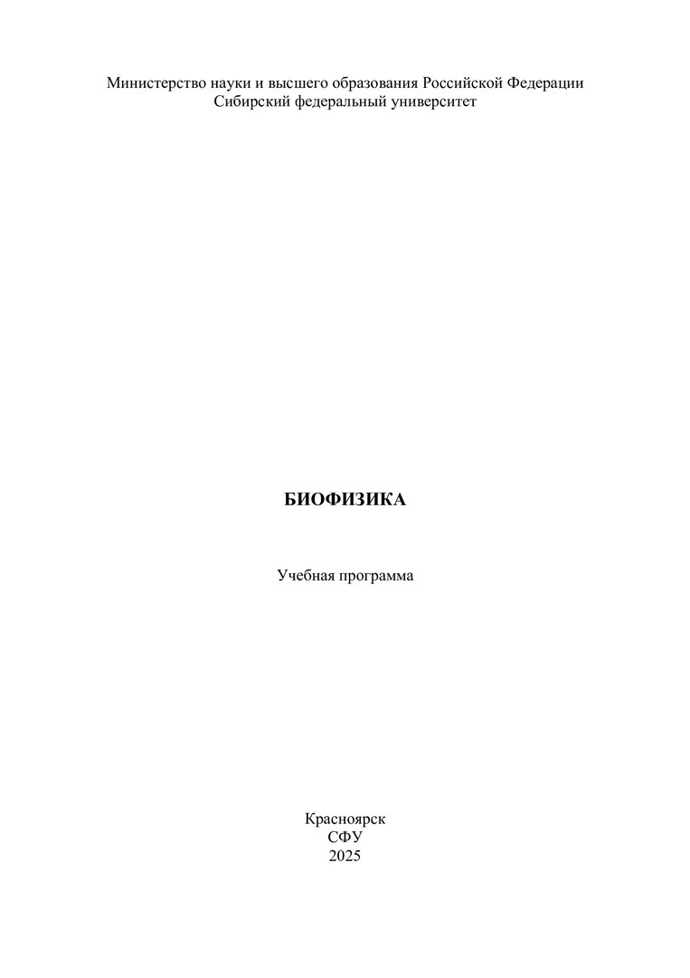 Библиографическое описание:Биофизика : учебная программа / Сибирский федеральный университет ; сост.: И. Г. Торгашина, С. В. Трифонов, С. И. Барцев, В. А. Кратасюк. - Электрон. текстовые дан. (pdf, 2.3 Мб). - Красноярск : СФУ, 2025 (2025-07-18). - 20 с. : табл. - Загл. с титул. экрана. - Электрон. версия печ. публикации . - Библиогр.: с. 15-16. - 100 экз. - Изд. № 2025-24722 : Б. ц. - Текст : электронный.