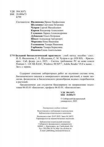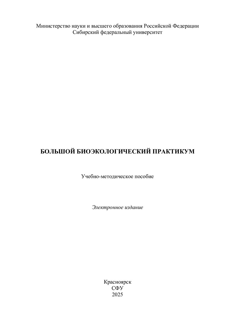 Библиографическое описание: Большой биоэкологический практикум : учебно-методическое пособие: [лабораторные работы] / Сибирский федеральный университет, Институт фундаментальной биологии и биотехнологии ; сост. И. П. Филиппова, С. П. Шулепина, С. М. Чупров [и др.]. - Электрон. текстовые дан. (pdf, 2,7 Мб). - Красноярск : СФУ, 2025 (2025-07-28). - 67 с. - Загл. с титул. экрана. - Изд. № 2025-24872 : Б. ц. - Текст : электронный.