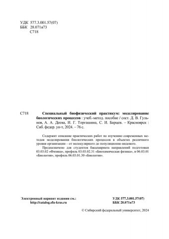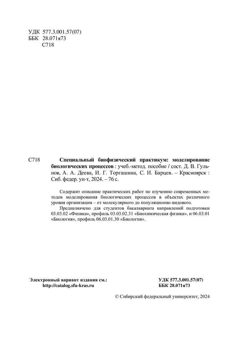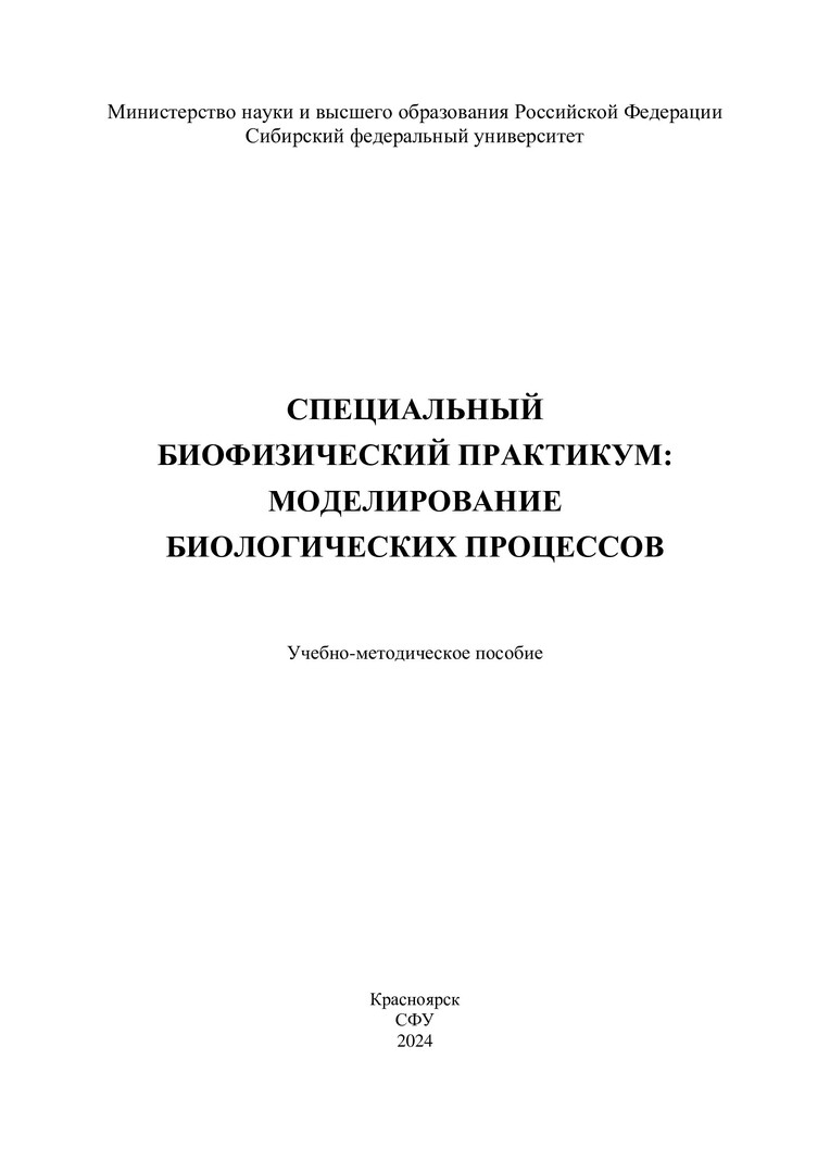 Библиографическое описание: Специальный биофизический практикум: моделирование биологических процессов : учебно-методическое пособие / Сибирский федеральный университет, Институт фундаментальной биологии и биотехнологии ; сост. Д. В. Гульнов [и др.]. - Электрон. текстовые дан. (3,0 Мб). - Красноярск : СФУ, 2024 (2024-03-19). - 76 с., 8.5 усл. печ. л. : ил., табл. - Загл. с титул. экрана. - Электрон. версия печ. публикации . - Библиогр.: с. 74-75. - 100 экз. - Изд. № 2023-20779 : Б. ц. - Текст : электронный.