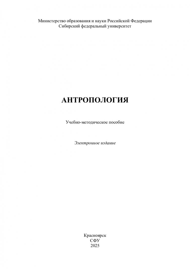 Библиографическое описание:Антропология : учебно-методическое пособие / Сибирский федеральный университет, Институт фундаментальной биологии и биотехнологии ; сост. Ю. С. Акопова. - Электрон. текстовые дан. (pdf, 1.2 Мб). - Красноярск : СФУ, 2025. - 66 с. - Загл. с титул. экрана. - Изд. № 2025-25543 : Б. ц. - Текст : электронный.