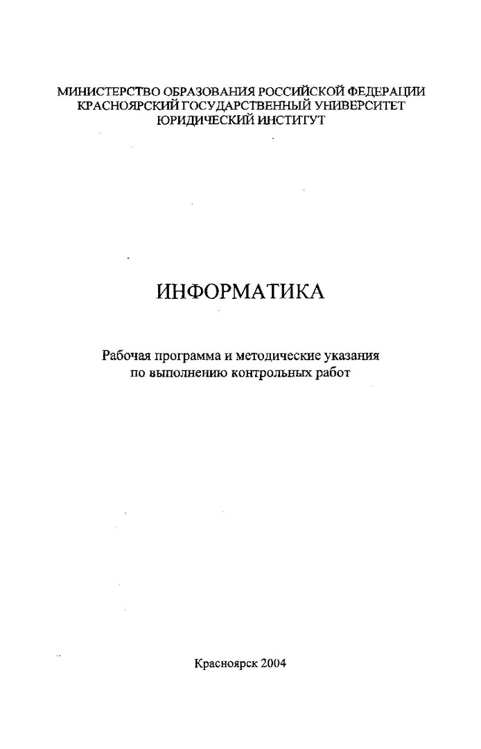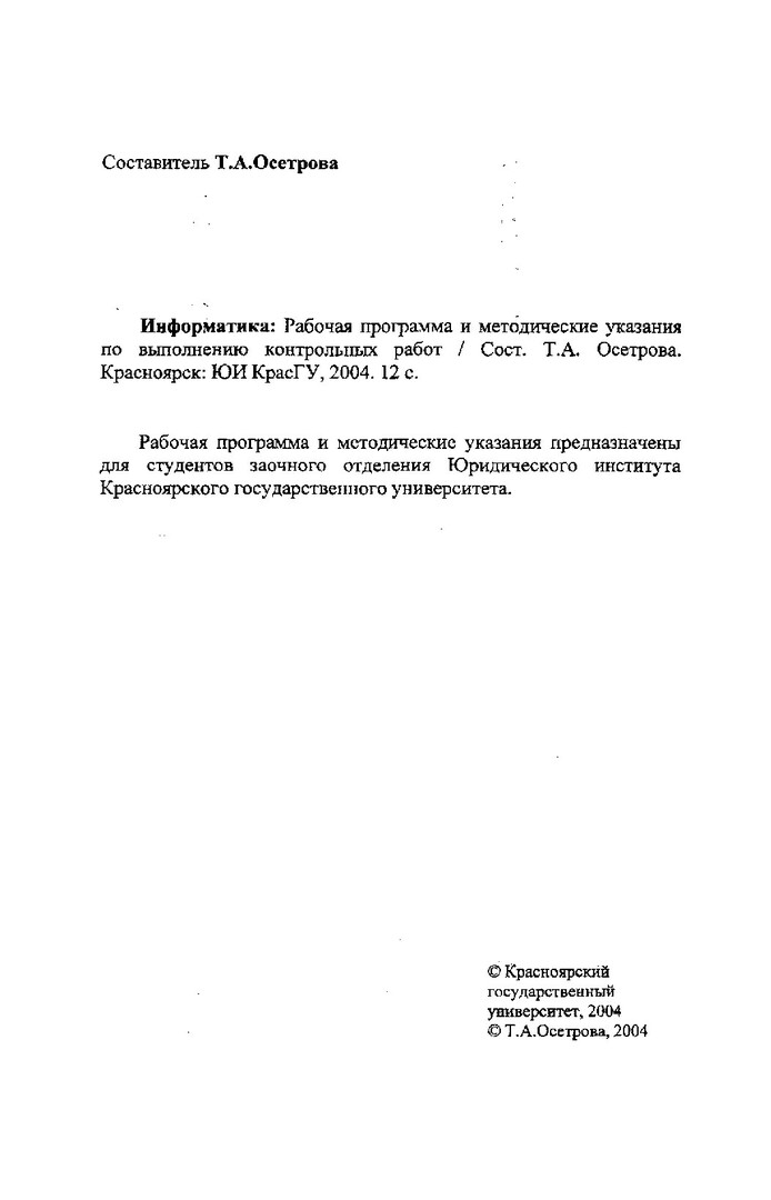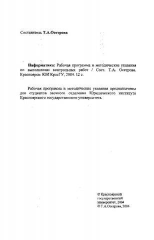 Библиографическое описание:Информатика : рабочая программа и метод. указ. по выполнению контр. работ / сост. Т. А. Осетрова. - Электрон. текстовые дан. - Красноярск : ИЦ КрасГУ, 2004. - (Электронная библиотека СФУ). - Загл. с титул. экрана. - Текст : электронный.