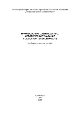 Библиографическое описание: Промысловое оленеводство : методические указания к самостоятельной работе: учебно-методическое пособие / Сибирский федеральный университет, Институт экологии и географии ; сост. А. П. Савченко, А. Н. Муравьев, П. А. Савченко, Н. В. Карпова. - Электрон. текстовые дан. (6,8 Мб). - Красноярск : СФУ, 2025 (2025-01-31). - 156 с., 9.0 усл. печ. л. : цв. ил., табл. - Загл. с титул. экрана. - Электрон. версия печ. публикации . - Библиогр.: с. 148-154. - 100 экз. - Изд. № 2025-23692 : Б. ц. - Текст : электронный.