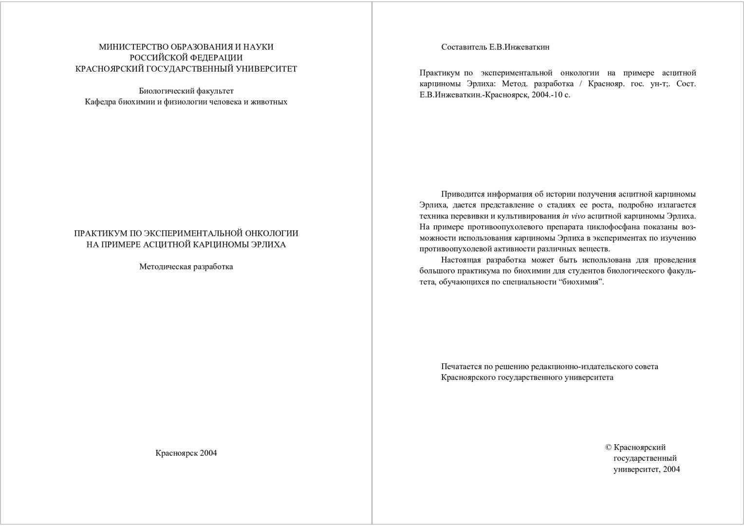 Библиографическое описание:Практикум по экспериментальной онкологии на примере асцитной карциномы Эрлиха : методическая разработка / Краснояр. гос. ун-т ; сост. Е. В. Инжеваткин. - Электрон. текстовые дан. (165 Кб). - Красноярск : КрасГУ, 2004. - Загл. с титул. экрана. - Электрон. версия печатного издания. - Б. ц. - Текст : электронный.