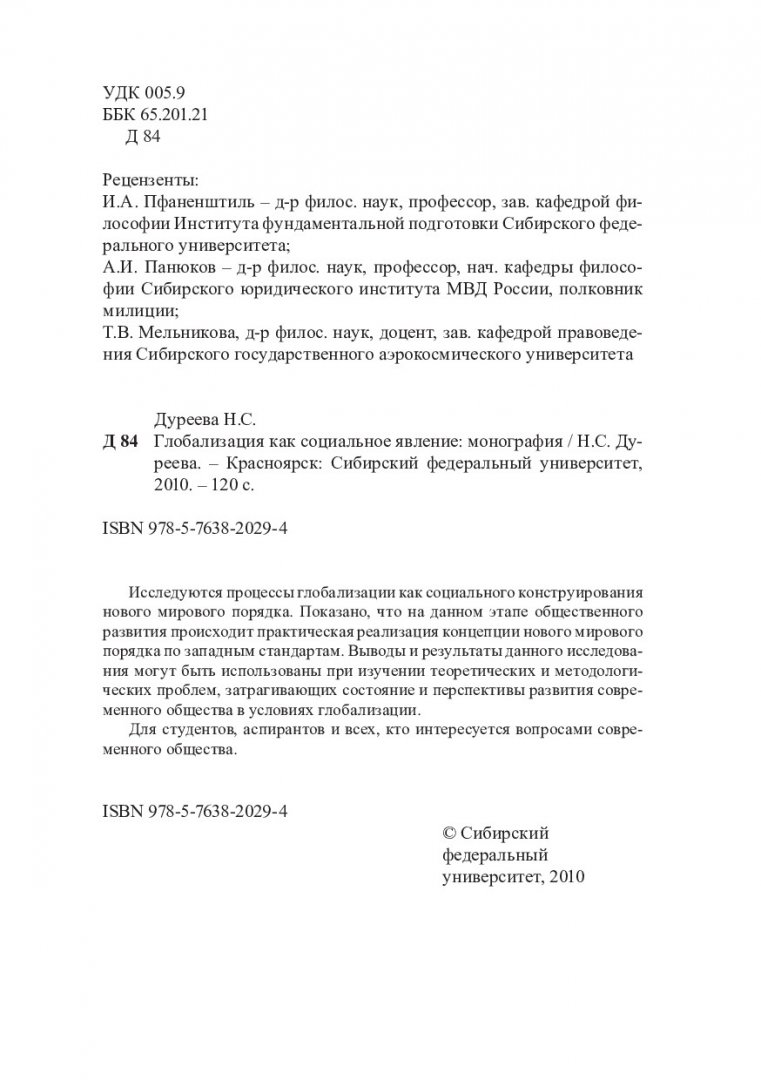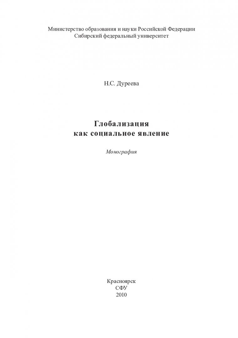 Библиографическое описание: Дуреева, Наталья Сергеевна. Глобализация как социальное явление : монография / Н. С. Дуреева ; Сибирский федеральный университет [СФУ]. - Красноярск : Сибирский федеральный университет [СФУ], 2010. - 119 с. - Список лит.: с.111-119. - ISBN 978-5-7638-2029-4 : 49 р. - Текст : непосредственный + Текст : электронный.