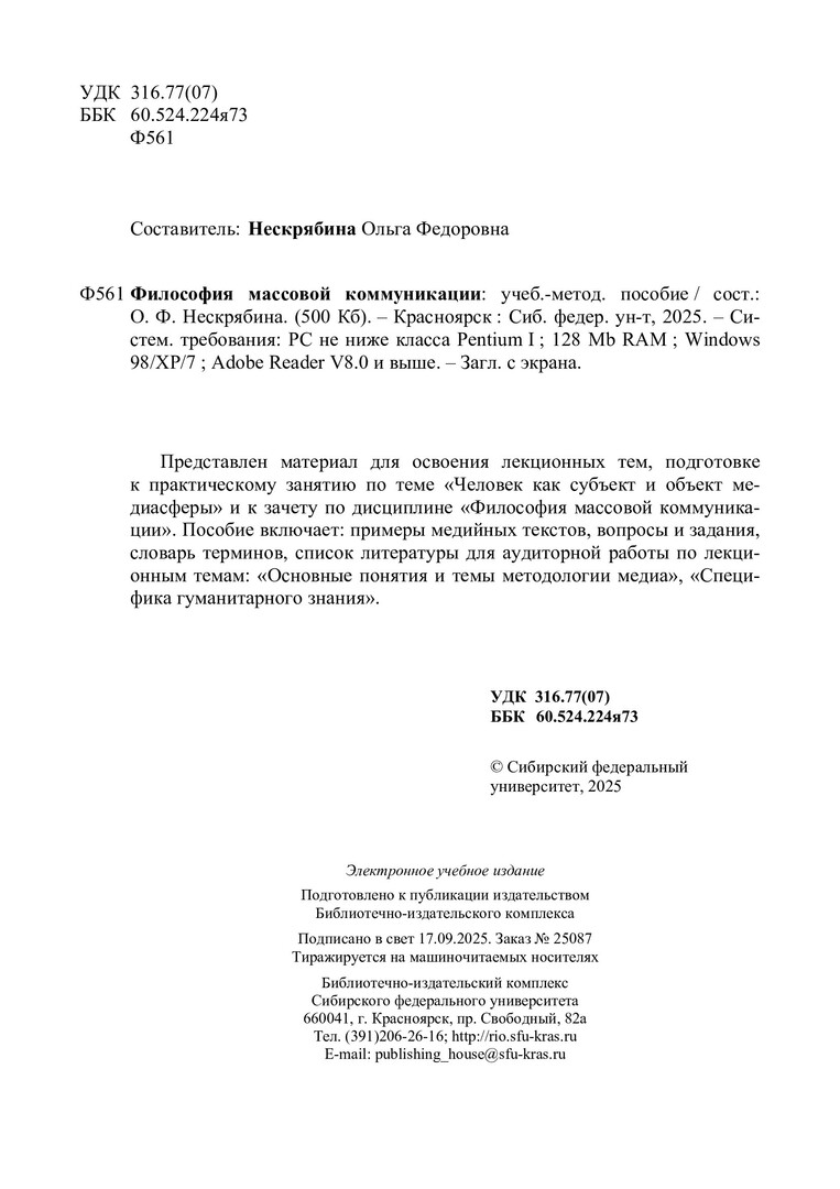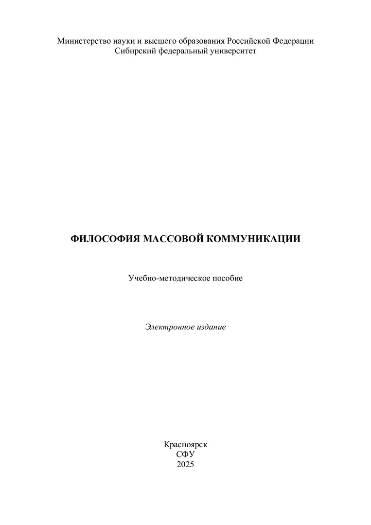 Библиографическое описание: Философия массовой коммуникации : учебно-методическое пособие / Сибирский федеральный университет, Институт филологии и языковой коммуникации ; сост. О. Ф. Нескрябина. - Электрон. текстовые дан. (pdf, 4.5 Мб). - Красноярск : СФУ, 2025 (2025-09-17). - 90 с. - Загл. с титул. экрана. - Изд. № 2025-25087 : Б. ц. - Текст : электронный.