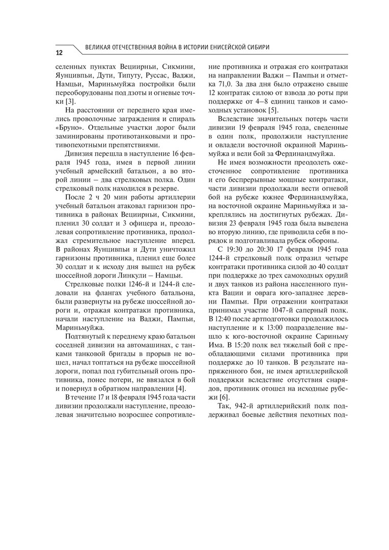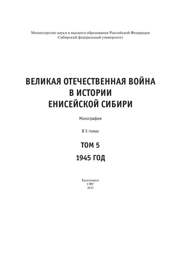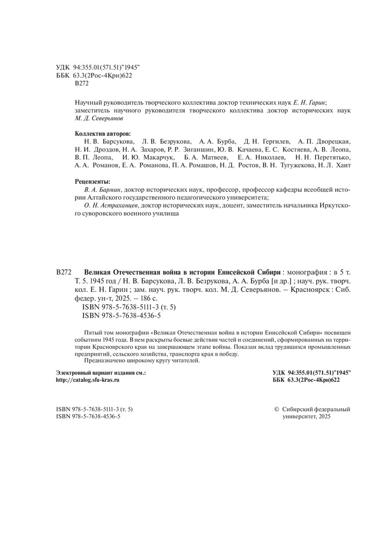Библиографическое описание:Великая Отечественная война в истории Енисейской Сибири : монография: в 5 томах / Сибирский федеральный университет, Военно-инженерный институт; науч. рук. творч. кол. Е. Н. Гарин ; зам. рук. творч. кол. М. Д. Северьянов. - Красноярск : СФУ, 2021 - 2025. - ISBN 978-5-7638-4536-5. - Текст : электронный. + Текст : непосредственный. Т. 5 : 1945 год / [Е. Н. Гарин, М. Д. Северьянов, Н. В. Барсукова [и др.] ; рец.: В. А. Бармин, О. Н. Астраханцев]. - 2025 (2025-04-02). - 186 с., 15.1 усл. печ. л. : табл. - 500 экз. - ISBN 978-5-7638-5111-3 : 250 р. - Изд. № 2025-23989